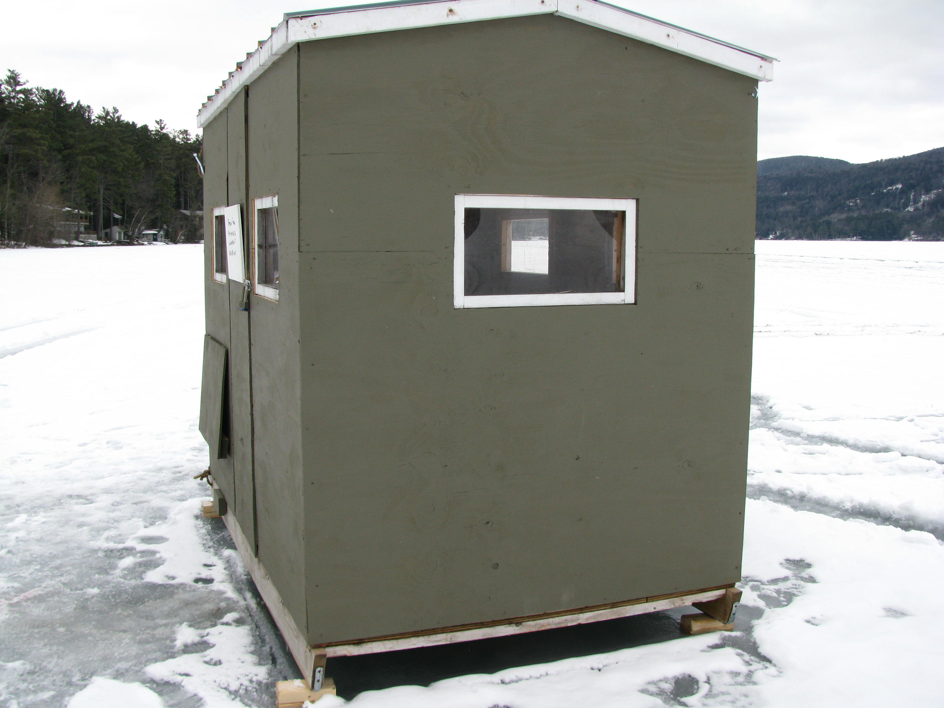 This was ice fishing derby weekend on the lake where I live. Last night the people who belong to this particular ice fishing shanty–and who clearly have a sense of humor–were possibly up all night, bright lights ablaze (still shining when I went to sleep past midnight), presumably attempting to hook the prize winning catch. And judging from the message, who knows? Maybe they did. (Note: if you are versed in the ways of the ice fisher, please avert your gaze, gentle reader, as I know not whereof I speak. Not gonna stop me from posting about it one dang second.)