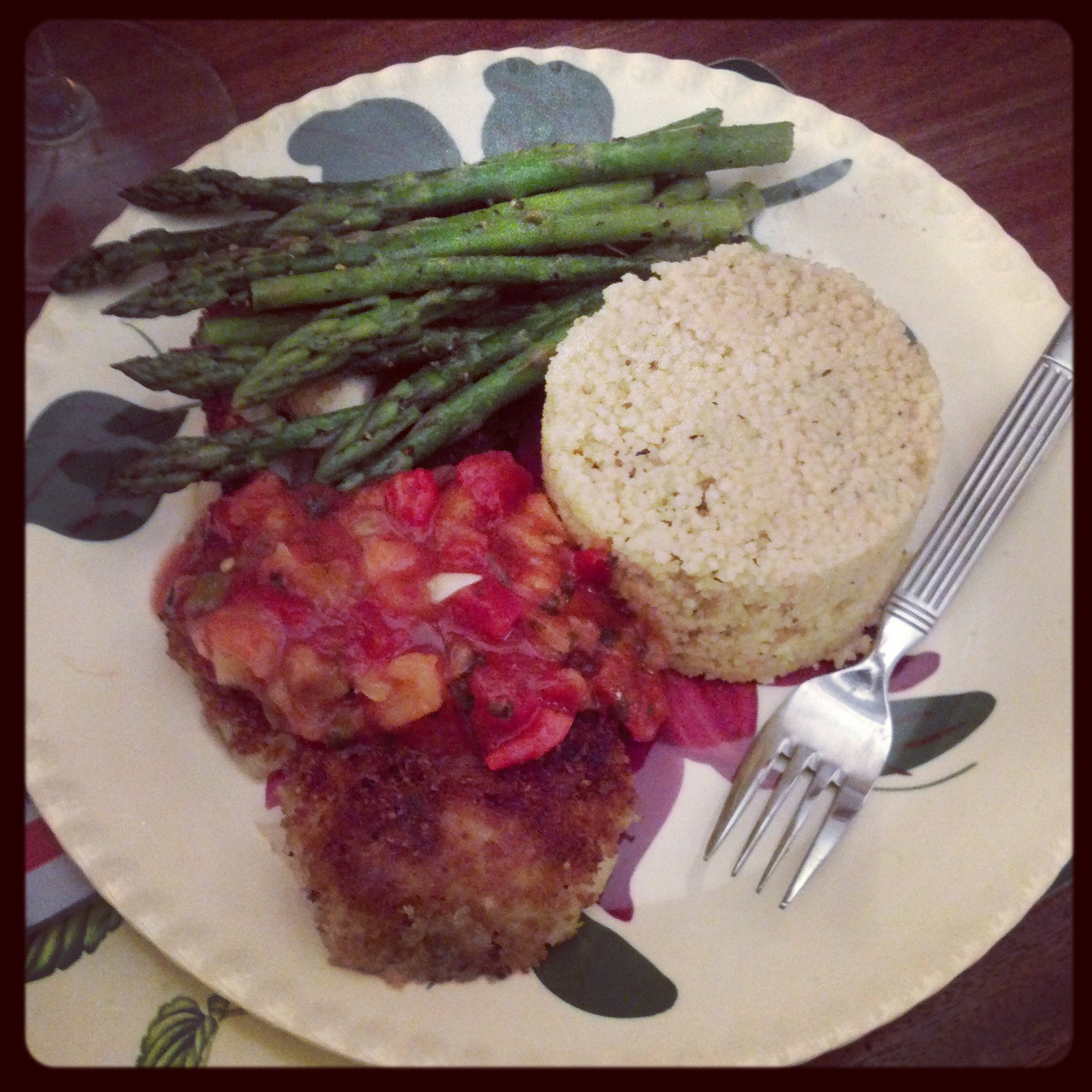 Yes, really. He was still wearing his chef’s scrubs from the work day, and busily trying to get dinner on the table for two very tired working people. The result was a lovely piece of cod with fresh salsa, asparagus and couscous: