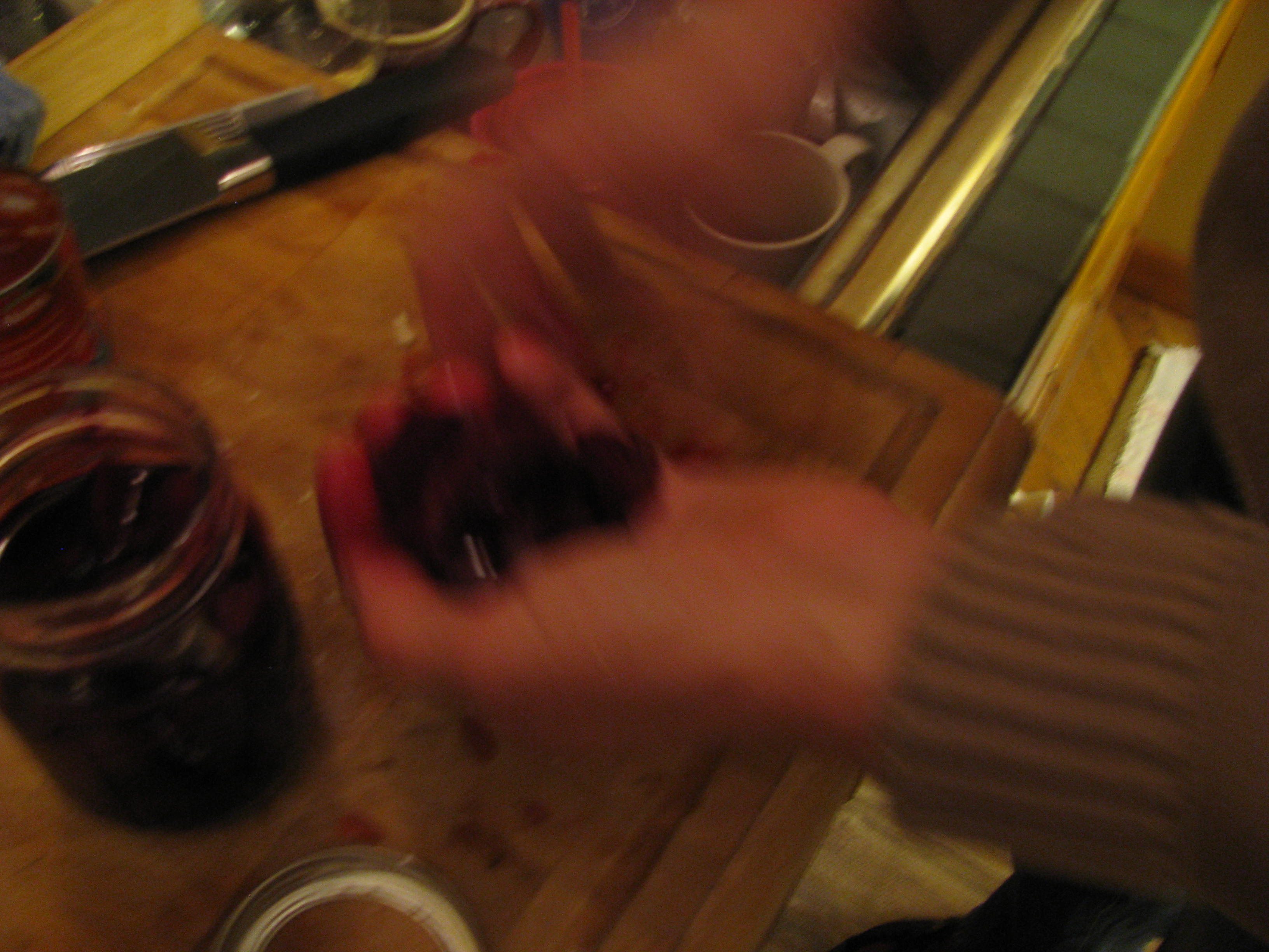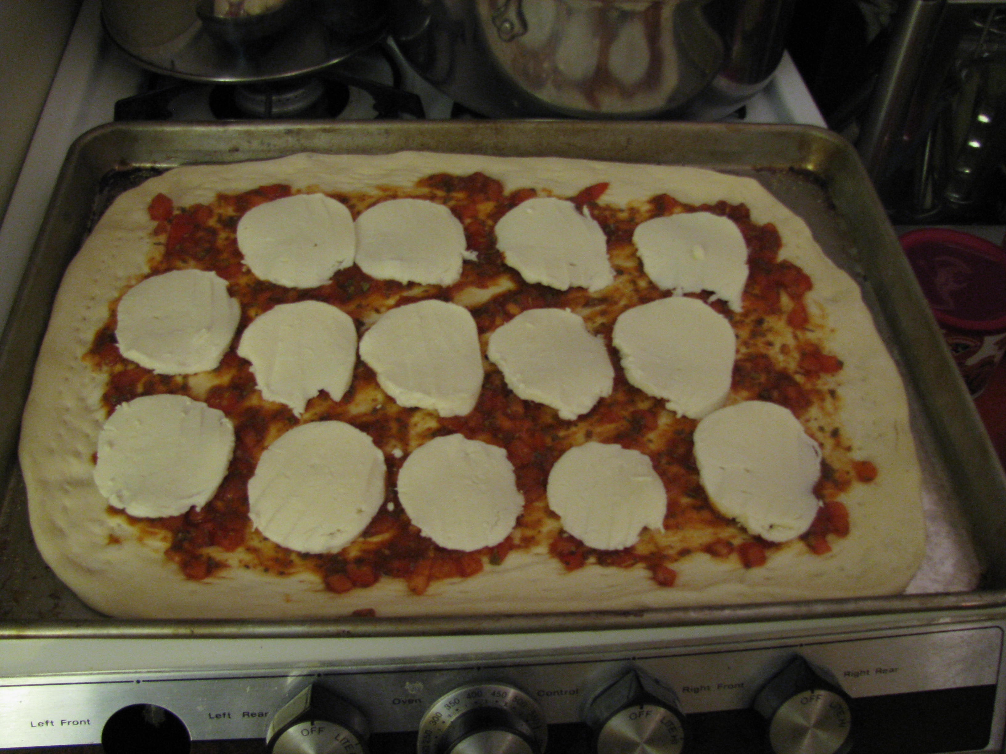 And while the quality of the photos is crummy, you get the drift.  There was also fresh mozzarella and pizza dough in the fridge.  So when we came home from our movie date last night (Sandra Bullock, George Clooney, Gravity, 90 minutes of white-knuckled hand holding), HCB got to work assembling a pizza.  He moves fast and I never really got a photo of his work in progress without a blurry hand.  Plus, it drives him crazy when I (attempt to) photograph him in the kitchen, or at all, really, so the soundtrack for this process was, Hey–stop taking PICTURES!