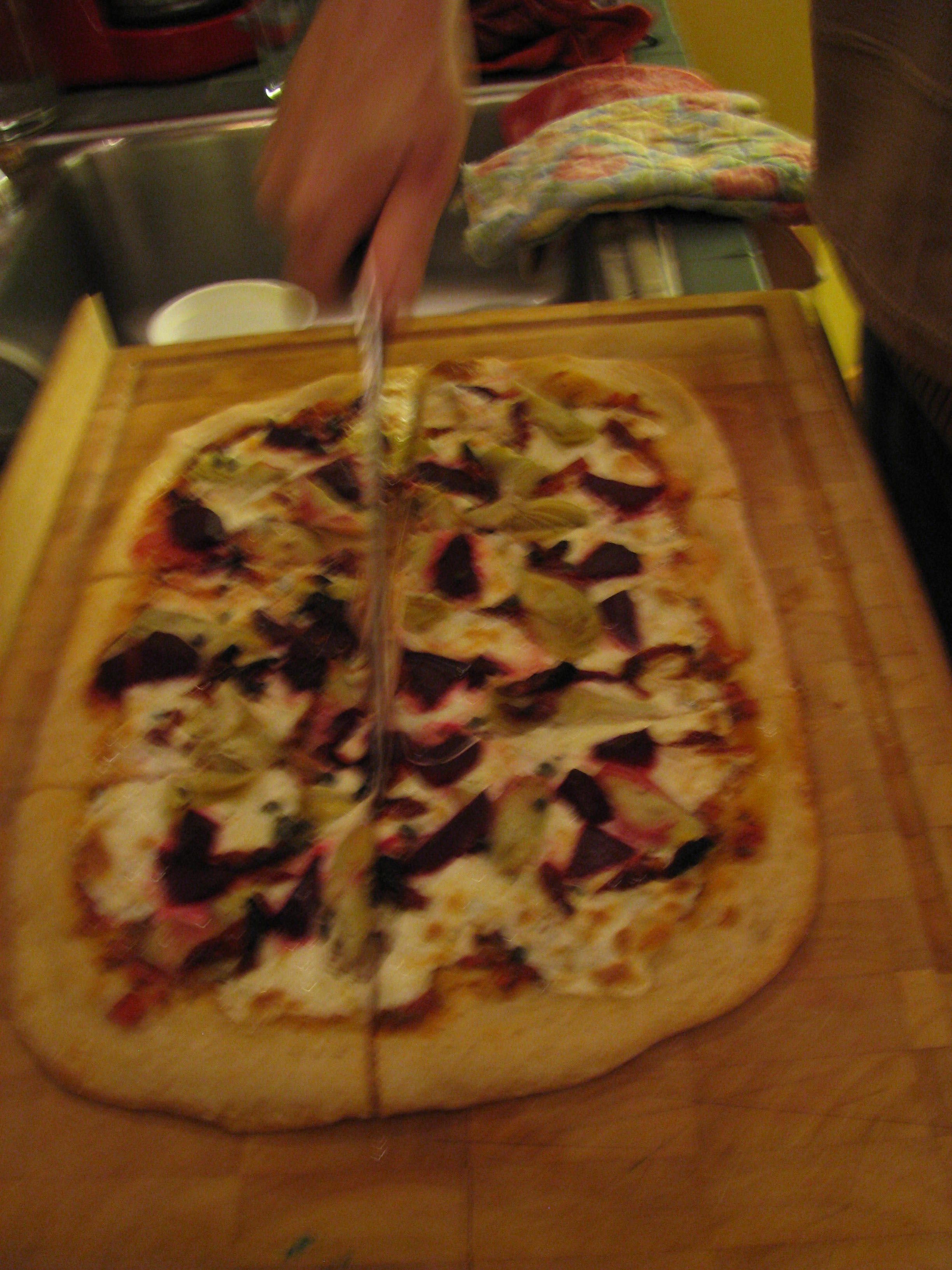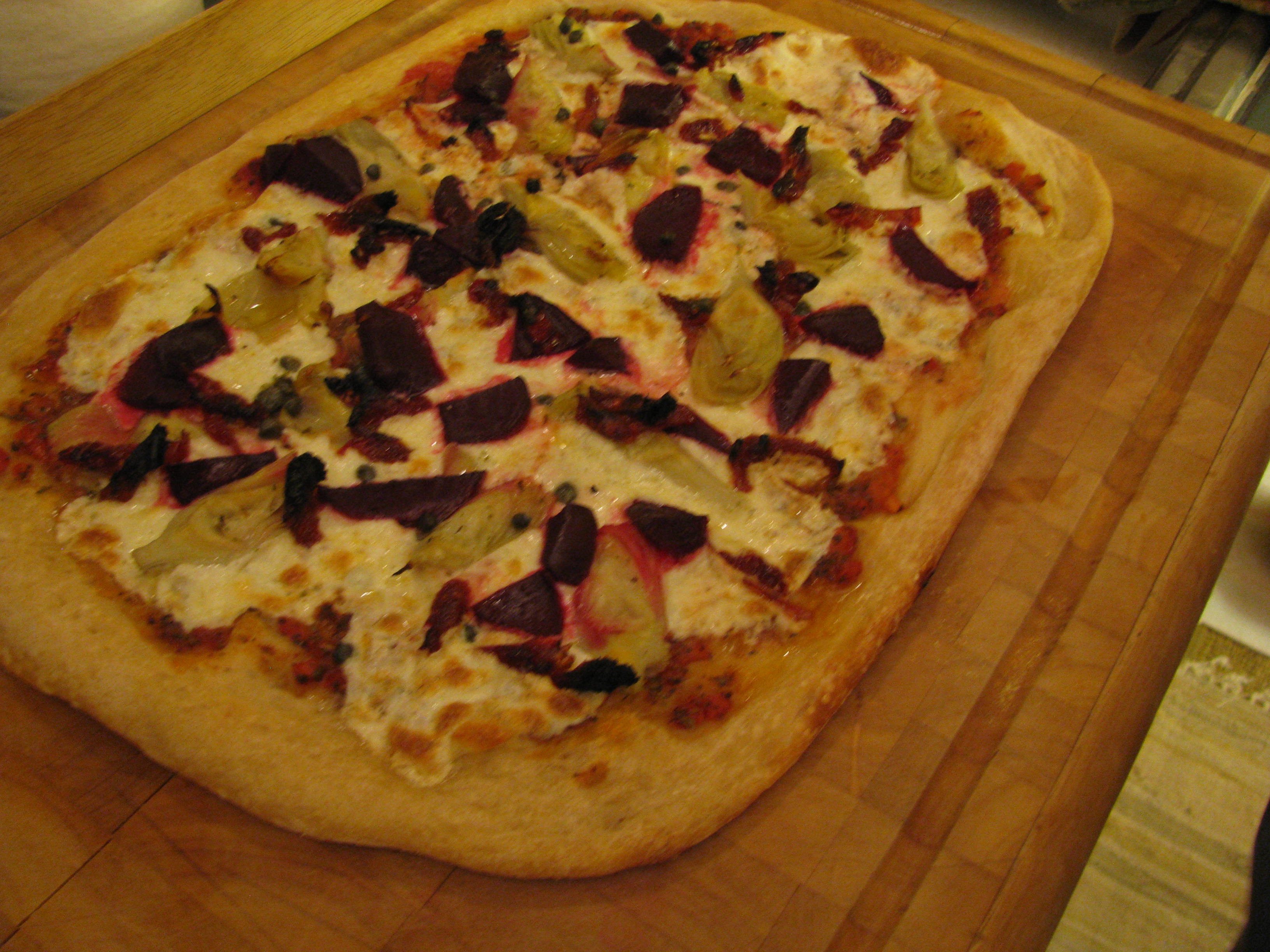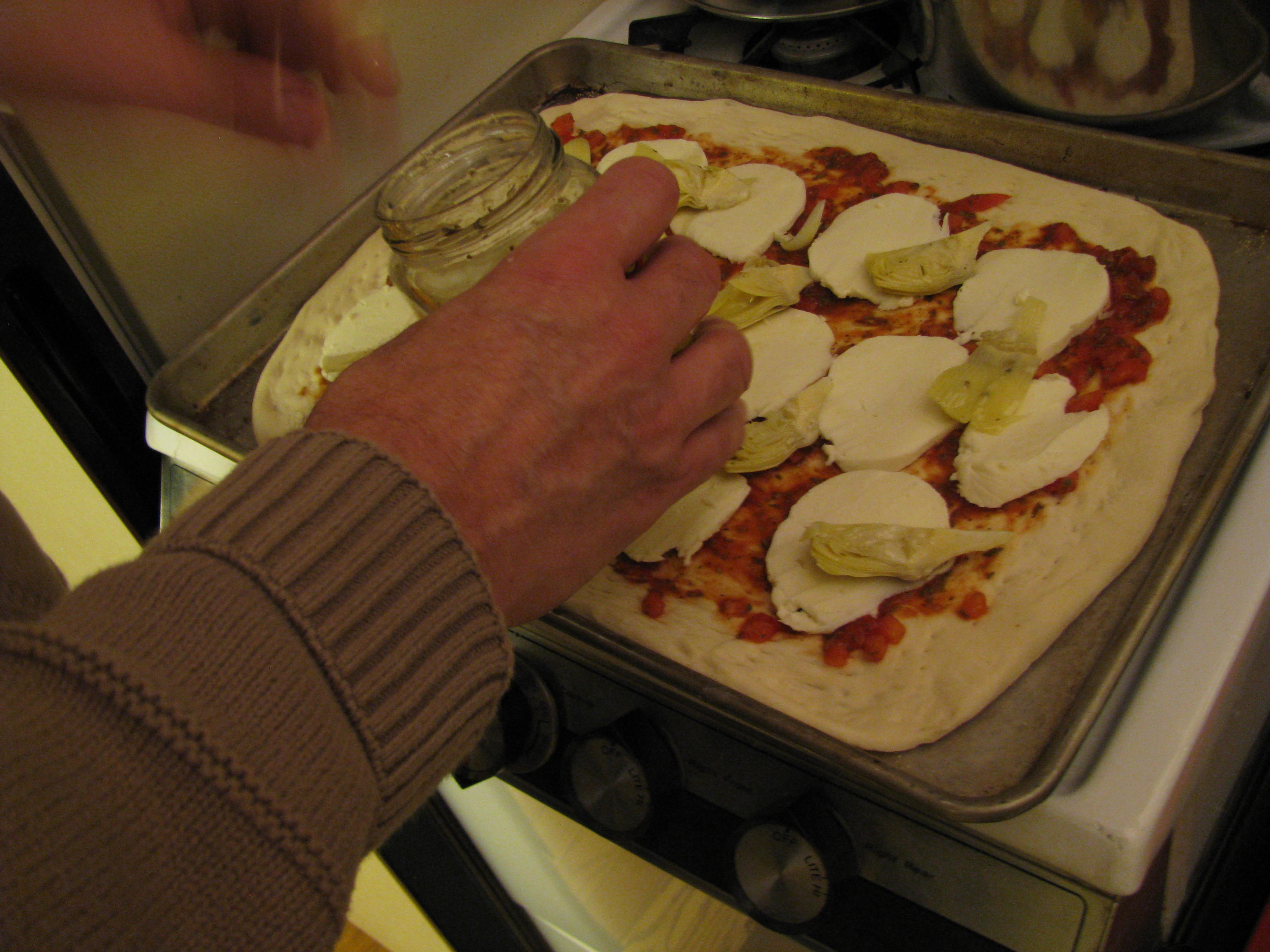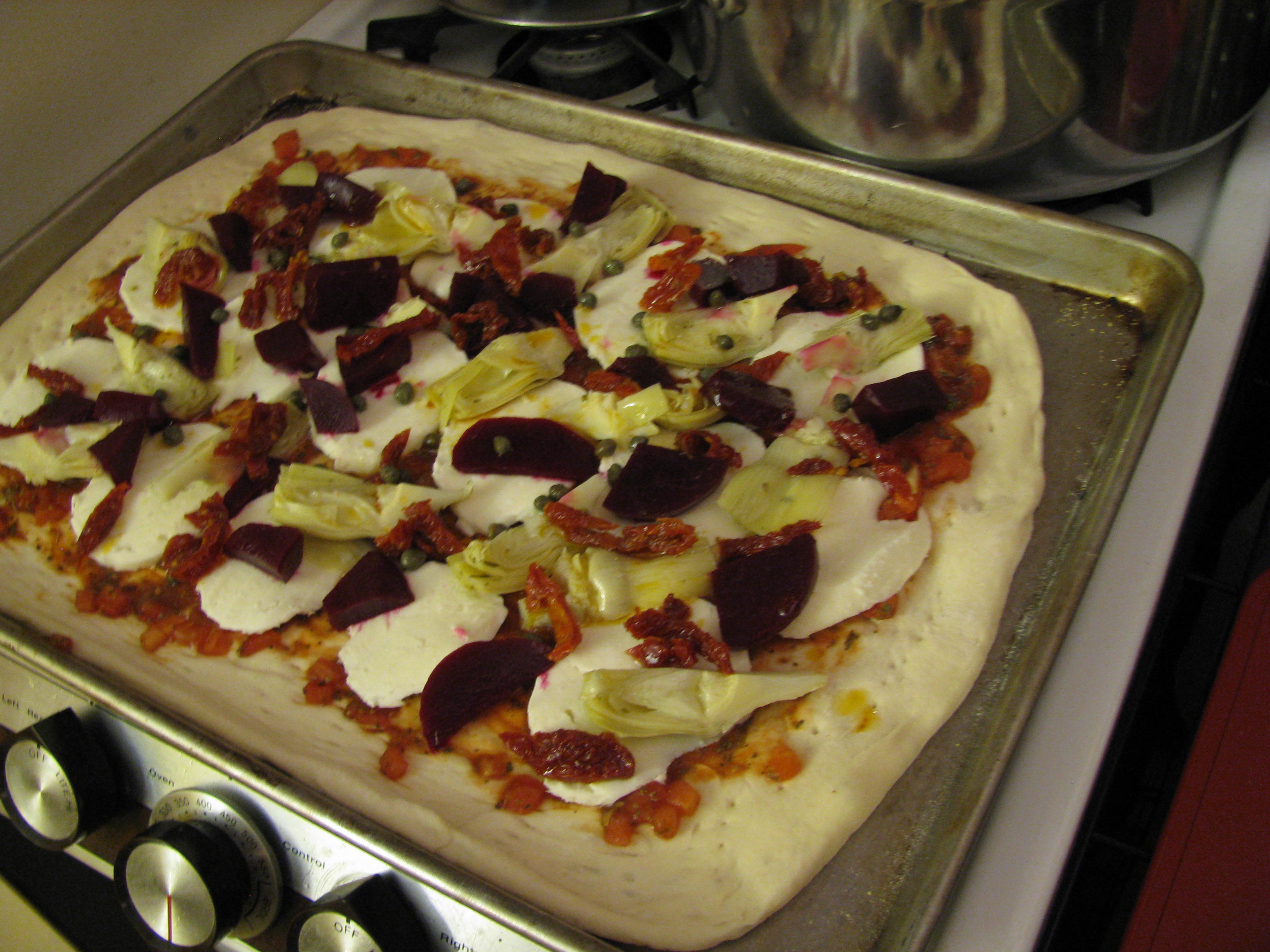 Ever get a hankerin’ for a bite of something or other, and you just can’t leave it alone until you satisfy it?  This has been the case for me over the past month or so:  an insatiable appetite for artichoke hearts and sun dried tomatoes–the wicked ones in a teeny jar of olive oil.  Those. On a pizza.