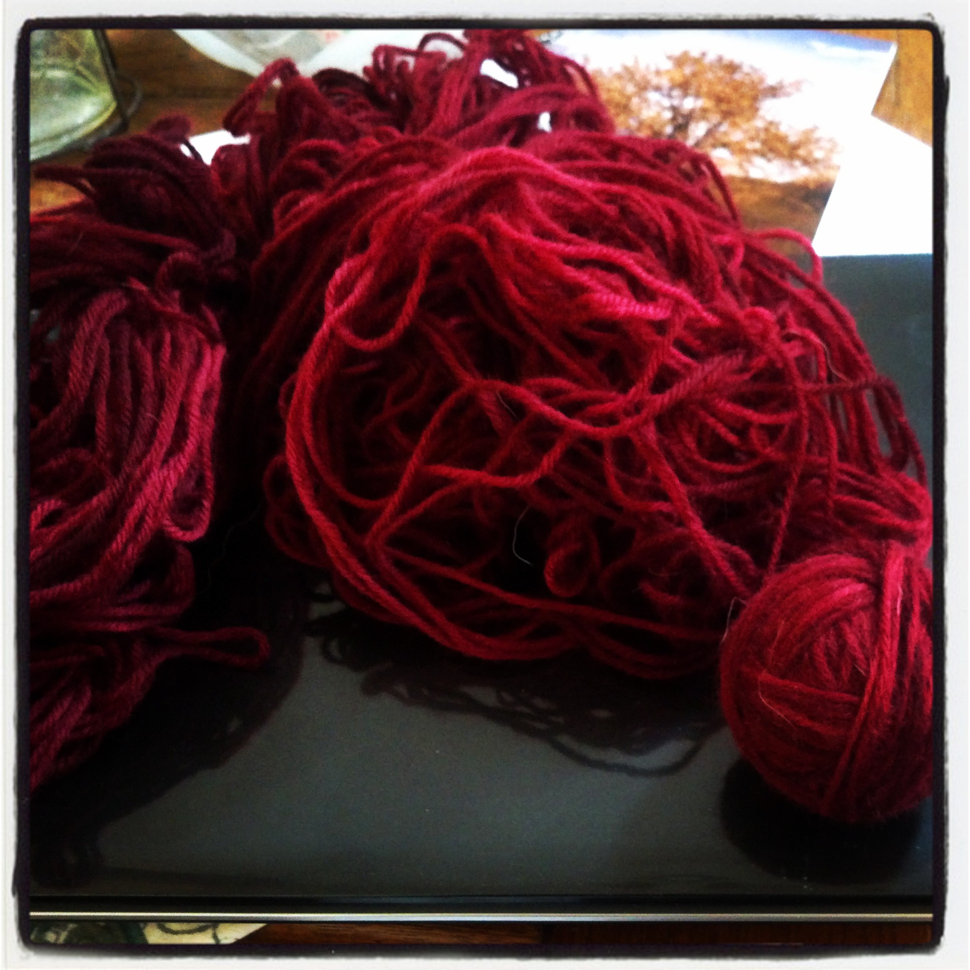 I found a loverly little skein of brand new wool from Chile in the bottom of my knitting bag. But in my haste to get started I quite forgot the part about carefully undoing it and looping it over the back of a dining chair–or over the hands of a friend–and making a ball. Completely forgot.