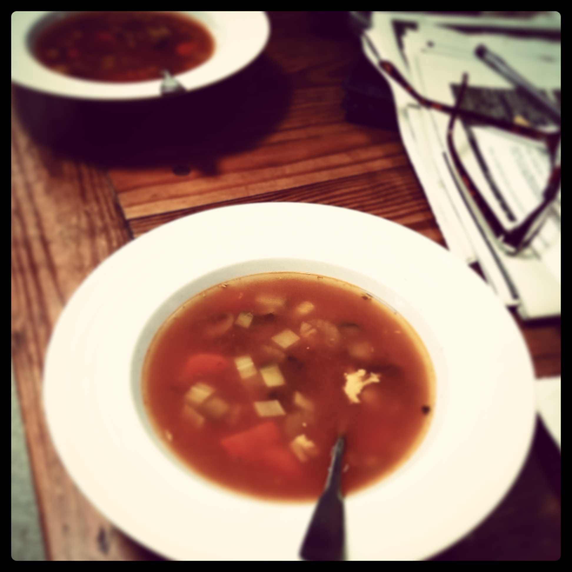 Late Friday evening and into the night that question posed itself again and again to me on the longish drive down to Handsome Chef Boyfriend’s place for a weekend visit. What will feed and nourish you for the weekend ahead, I wondered? I willed the answer: homemade chicken soup. My throat was sore and I was worn out. And I happened to know he had just baked a whole chicken only a few days before. I had sent a message to him via mental telepathy to make stock, and then of course soup. I walked into his place around 9:30 and the unmistakable savory wall of homemade chicken soup steam smacked me in the noggin; you can see the finished product in that photo at the top, which I made just before we lunched on leftovers a while ago. (Yes, I know how incredibly lucky I am.)