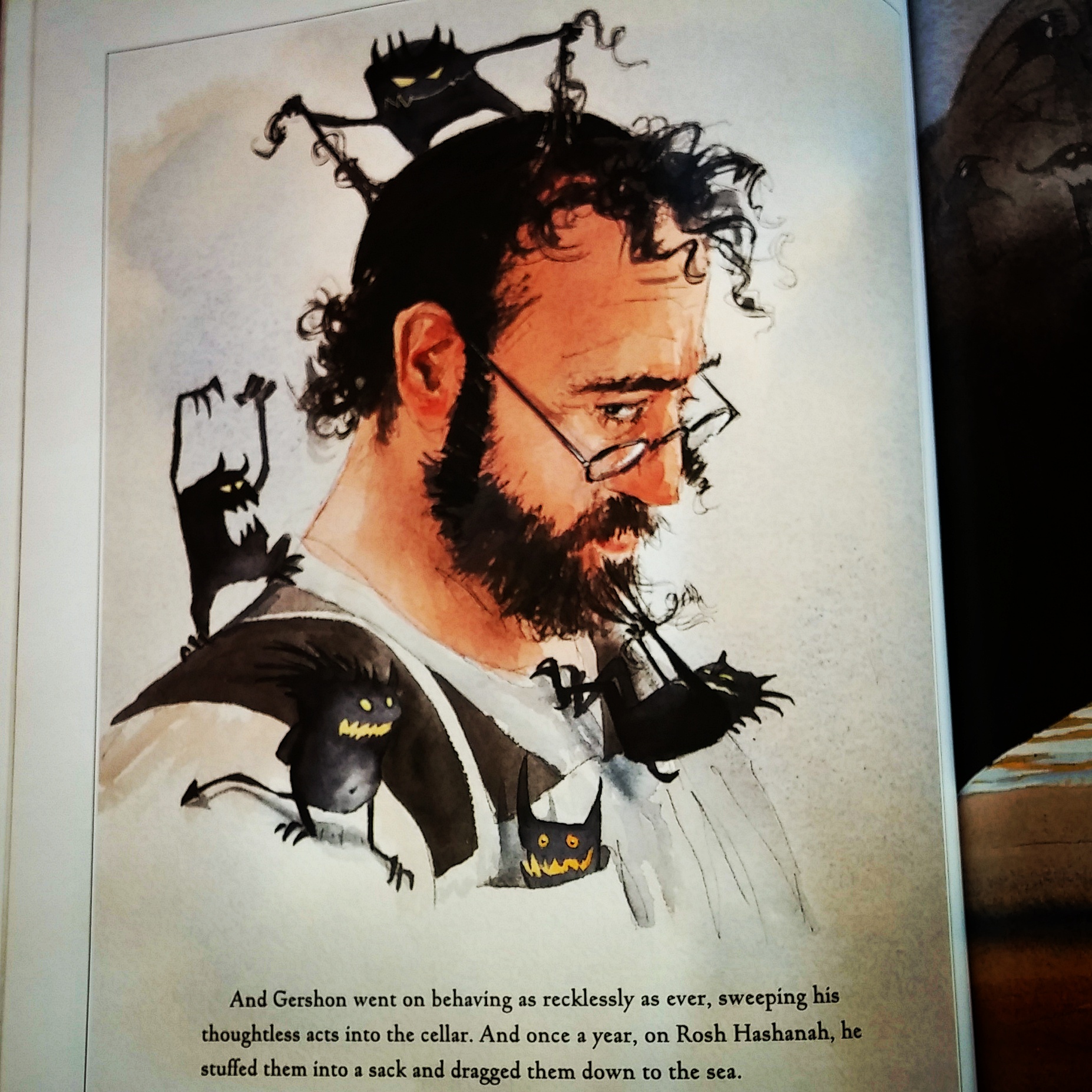 Gershon is a badly behaved man, but worse still does not care about his treatment of others. (In other words, he is someone you know.) He sweeps his misdeeds to the basement and once a year puts them in a huge bag–especially huge, it turns out, because his behavior is especially intolerable–and drags the bag down to empty into the sea. The problem is that he makes no effort to be truly sorry about his misdeeds. He simply gathers them up and disposes of them. When he and his wife decide they want children Gershon consults a Rabbi, who warns him away from parenting. Gershon presses the Rabbi who finally gives him a charm for his wife to wear for a year, after which time he prophesies she will bear twins.