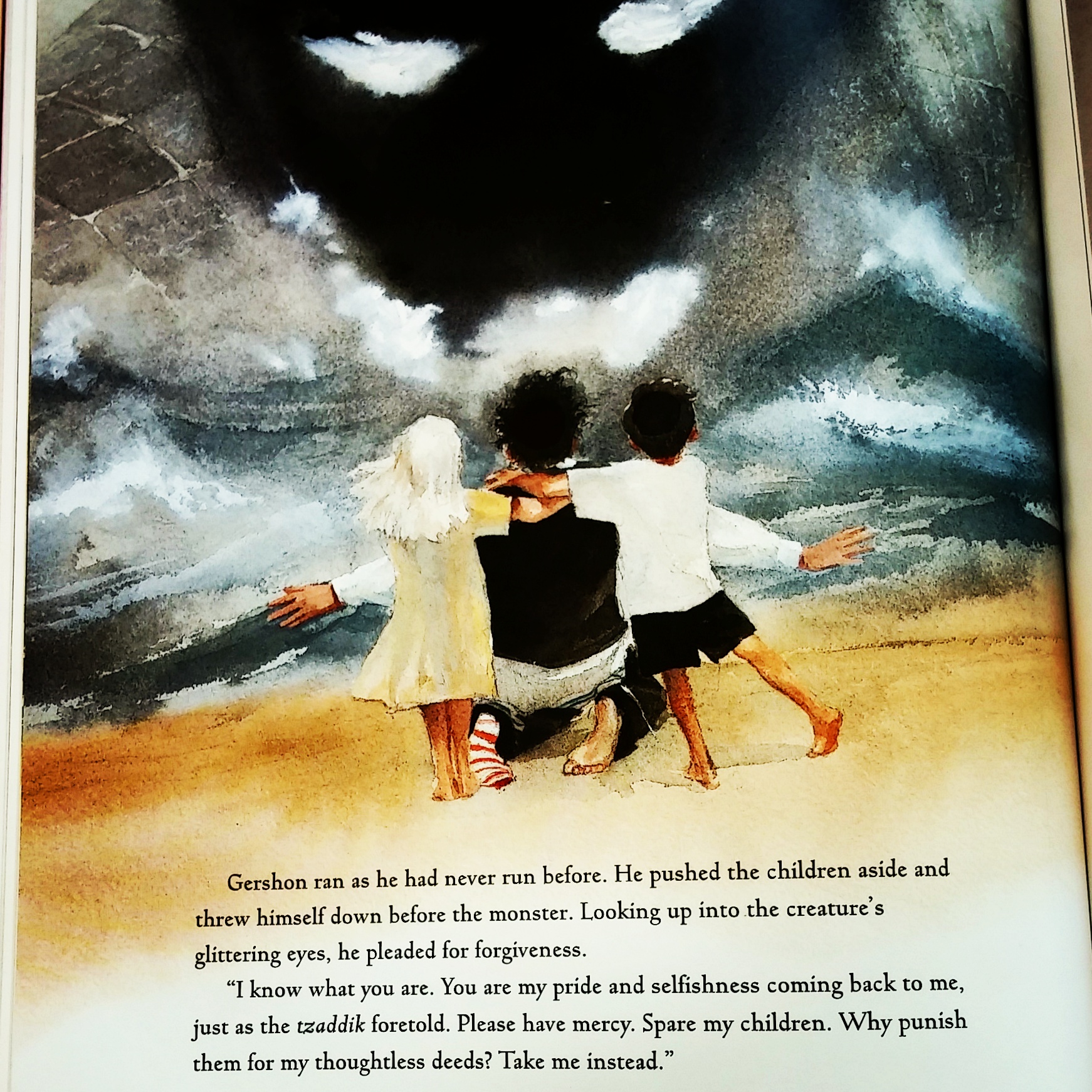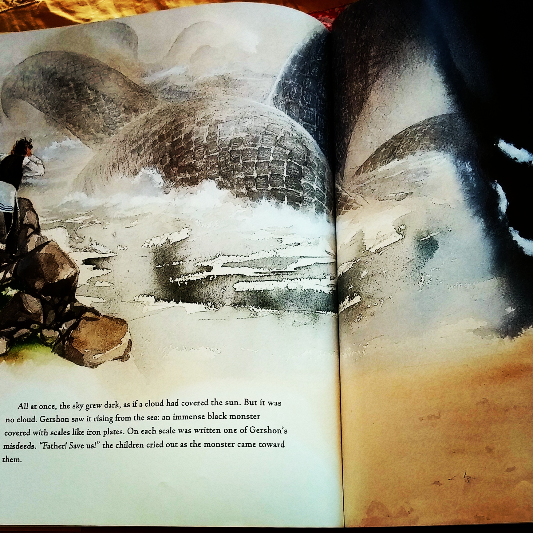 And of course, this is exactly what comes to pass. Gershon and his wife have twins–a boy and a girl. One morning Gershon awakens disoriented by the summer heat and (you guessed it) puts both socks on the same foot. The children have gone to play by the sea as they do every day, and Gershon rushes after them in a blind panic. He finds them confronting a horrible sea monster whose scales are inscribed with every awful thing Gershon has done in his life, just at the moment the monster is about to snap up the children.