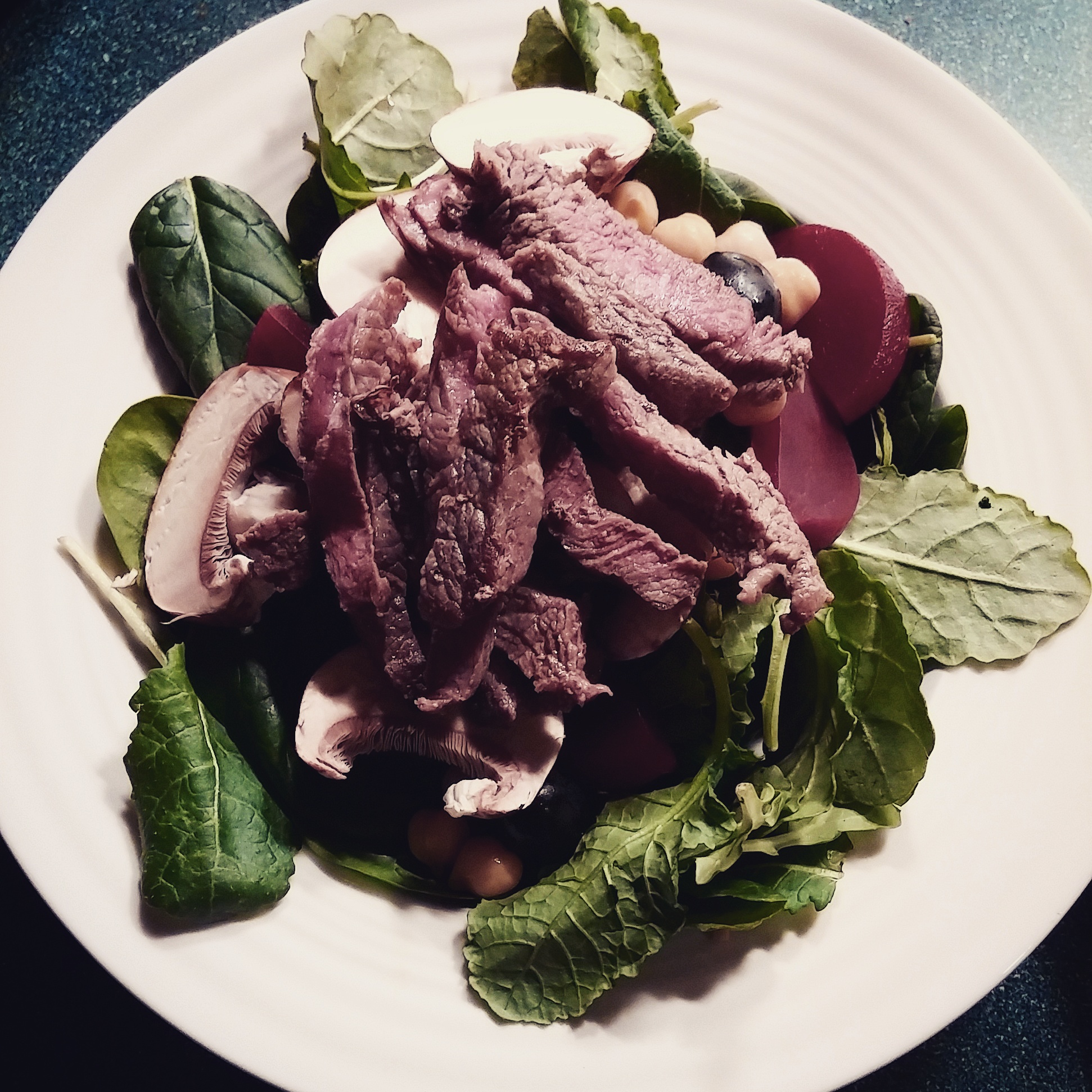 Probably best to distract myself. HCB made the kiddos their supper (snow day tomorrow, woo hoo), and then we got busy making our own: winter salad of spinach, baby kale, beets, garbanzos, olives, mushrooms, and flank steak. Sorry, vegetarian friends, but it was amazing.