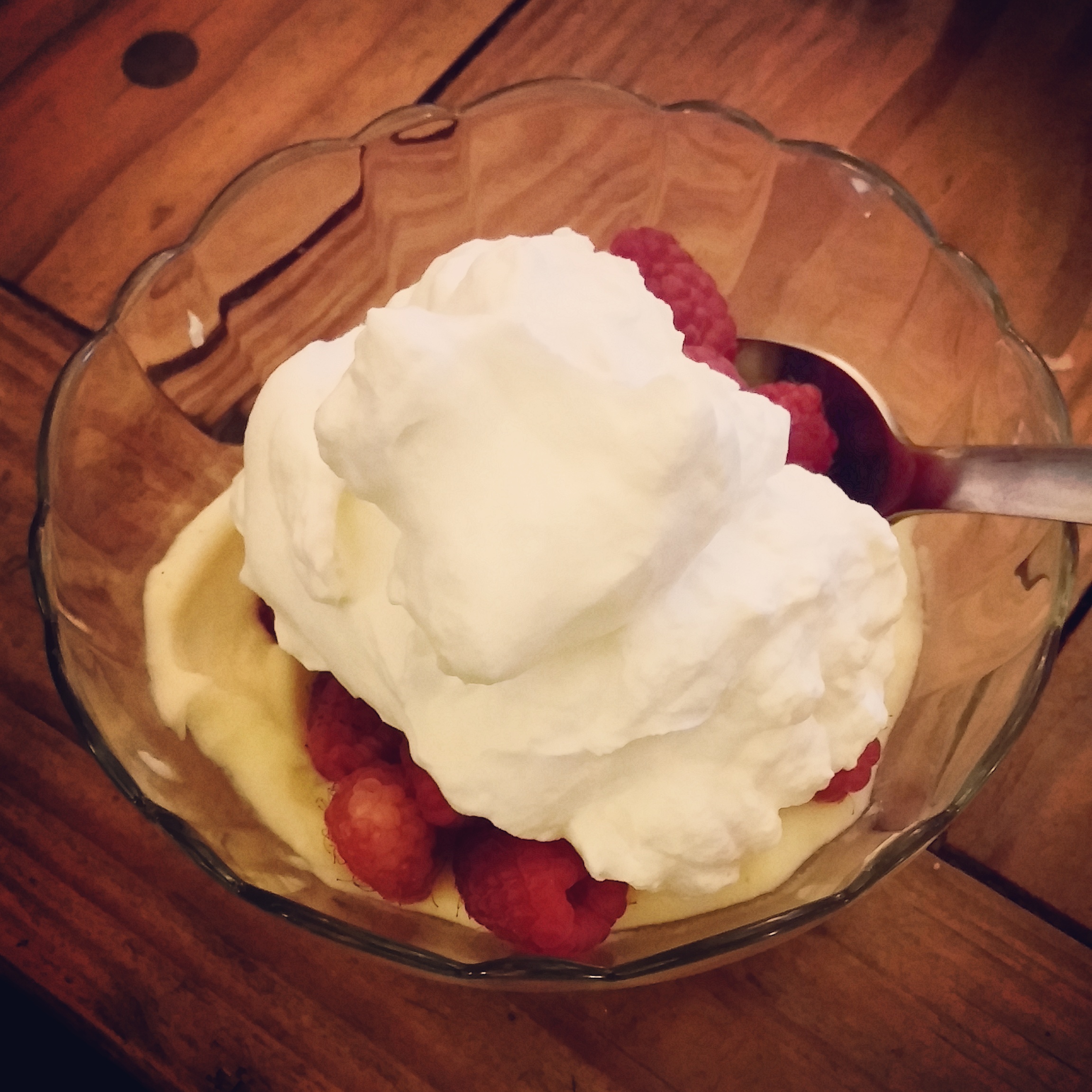 There will also be raspberries buried between layers of pastry cream and heavy whipped cream.