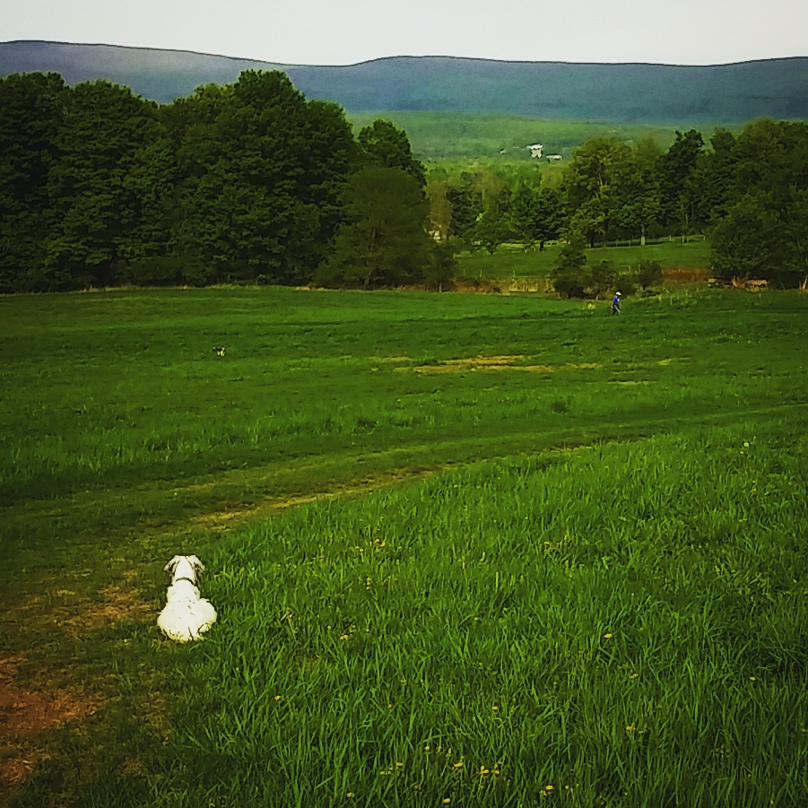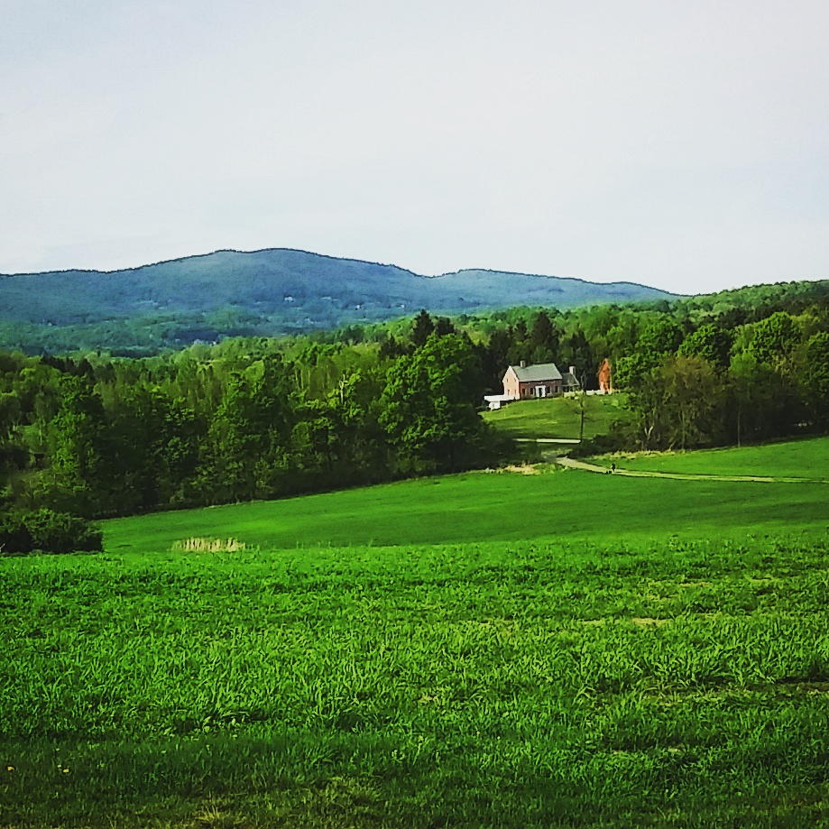 Friday was one of those intoxicating Vermont spring days where you think there must be some mistake in the landscape: nature’s greens can’t possibly be that, well, green. But there they are. More than once in recent days I have wanted to press pause and hang on to the neons betraying new foliage for just a little longer. And the vistas in the southwestern corner of the state where I live and work sometimes take away my breath, catching in my throat. But time waits for no one. My own taproot is taking hold, I can feel it. Friday afternoon I had the great pleasure of a nice romp in a huge field with my friend and her beautiful English setter, a variety known as a Llewellin: she is a dappled girl with a winsome smile and a shameless penchant for mud. She is also a love sponge, as she demonstrated after our walk. I have only a small handful of images to show for the romp, notably the view from a couple of spots (there were so many), and the plaque affixed to a historic bridge that was remarkably rescued from a dump and reassembled on this beautiful piece of land as a footbridge. A tiny souvenir of the afternoon, a gift from my friend, sits in a crystal bud vase in my kitchen windowsill. This is the prize after a big, bad winter. How reassuring to know so many things continue to take root against all odds.