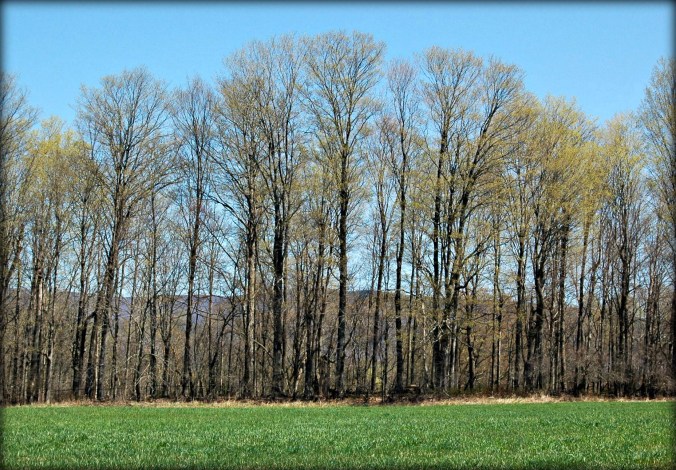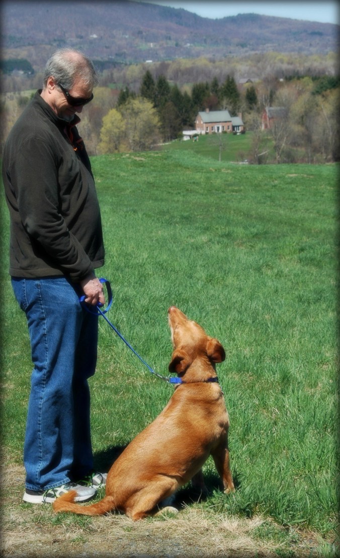 Yesterday we took my car through the tunnel for its springtime scrubbing, the annual cleansing away of the caustic chemicals that are part and parcel of winter travel; dad will chide me about this, my lazy car maintenance habits and the once-a-year wash “whether it needs it or not.” Last weekend we took Scout on a short outing to the Mile-Around Woods, where it is finally dry enough to walk without sinking knee deep into muddy trails. We meant to allow him some off-leash romping in a picturesque meadow at the top of the big hill there, but thought better of it when we observed a few others who had beaten us to the punch: it was the first gorgeous spring Sunday and nobody was missing it (Vermonters are fair-weather opportunists of necessity). This could not stop our fun on an exquisite day, if cut short by my bum foot, et al. I wore my camera around my neck to shoot the landscape as it is now, because it will look very different in only a few days; I managed to catch a single beautiful moment between Scout and The Chef, who despite his mild manners and generosity with tender, steaming bits of succulent chicken and fish, remains Tall And Scary to tawny little doggies.