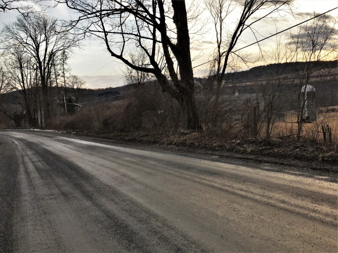 And then there is mud. When the weather has been warm enough to start melting snow and ice on the roads (or a tad more accurately the snow banks the plows create on the sides of the roads), as it has for the last few weeks, it takes time for all that moisture to dry out—time, as in weeks. The water’s gotta go somewhere. So a road that looks deceptively dry is actually fairly squishy and wet, for a long time. For running, it’s a fabulous surface—soft, with lots of joint-cushioning ‘give.’ You must make your peace with the reality that by the time you get back to the car, your legs and feet will be caked in a dried schmutz roughly the color of putty, and in truth probably also saturated in the chemicals that keep the roads passable during and after a winter storm.