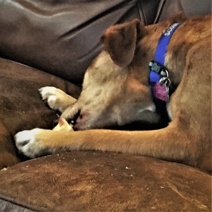 David pointed out that really, Scout is cagy about anything you give him, including his food. You can set a bowl of kibble laced with chunks of ham and Greek yogurt before him, and he will survey the landscape all around him before he starts eating—it’s almost like he’s checking to see whether somebody’s on the horizon waiting to swoop in and snap it up. Or maybe he’s asking permission: is this mine? Really?