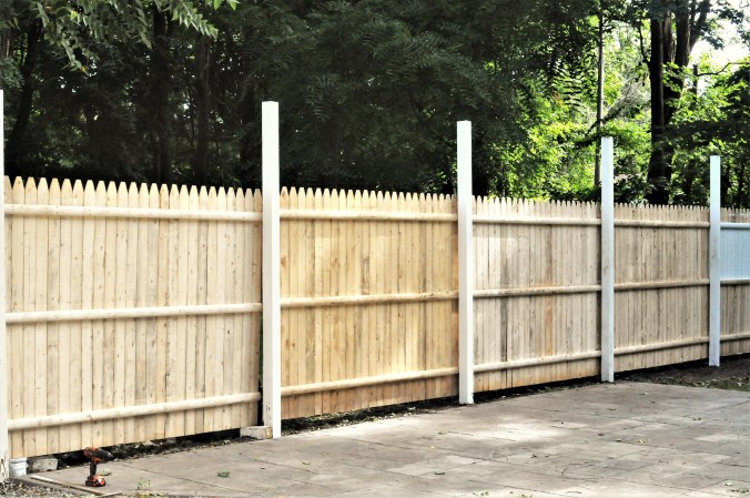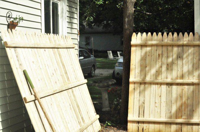 As for the rest of our fence project, it is coming right along. The Chef finished the first part of it last weekend, all except for the landscaping—which is to say, mulch. And there’s still time for flowering annuals this fall. He was a tad annoyed with me for shooting this section before we’d gotten around to that part. And if it looks a bit serpentine, that’s because it is: a couple of sections bend this way and that to accommodate a tree that more or less abuts the property line, near a spot where a posthole is situated (the Chef had a time with the tree roots, and was as respectful as he could be of them).
