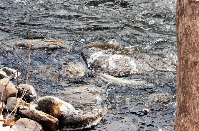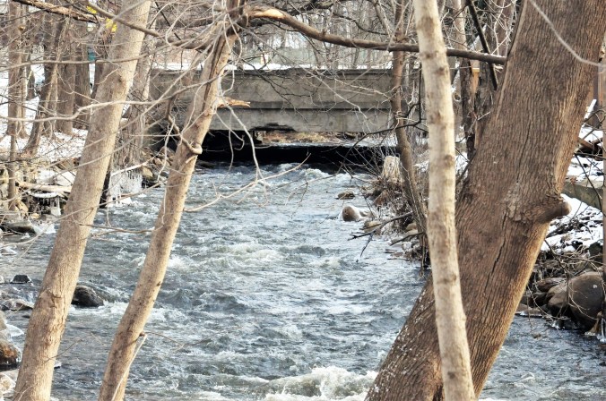And so it is, as it was last year. But this time, I believe it’s safe to say the river is roiling, and even so, yesterday when I made these photos, it was relatively tame compared with earlier in the week, when it rose higher than I’d seen it thus far: not quite to the top of its banks, but all the way to the bottom of the small bridges we can see from our back yard.