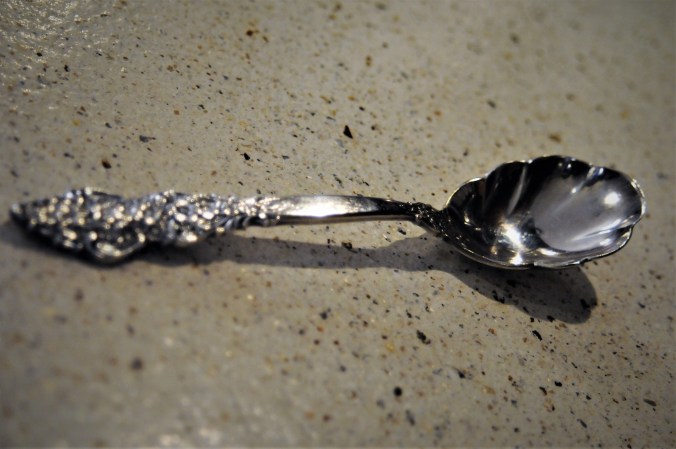 The silver, though, did not escape polishing. I love the spoon in the photo up there. Chef David and I fished it out of a 50¢ bin in a roadside antique store several years ago, and then once home discovered it’s sterling and not plate, as the sign on the bin indicated. Sweet. I also love how my great-grandmother Gracie’s tray, the one she received on her retirement from the Atomic Energy Commission after 26 years of service, looks so beautiful and fits so well on the Chef’s family heirloom credenza. Like they were meant to be together.