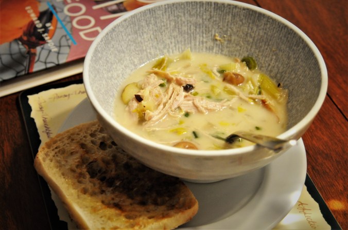 Tonight the Chef is playing hockey, his teenage daughter is upstairs doing teenage daughter-y things, and Scoutie’s on the sofa with his bum snuggled into me, the other end of him snoring away contentedly. I had creamy turkey soup for supper, a recipe I found on the ‘net a couple of days ago when somebody said he wanted a change from all the brothy soups we’ve been eating. Not bad, could be creamier. But I like the winter habit we’ve embraced of making a giant pot of soup on the weekend, that we eat on all week long.
