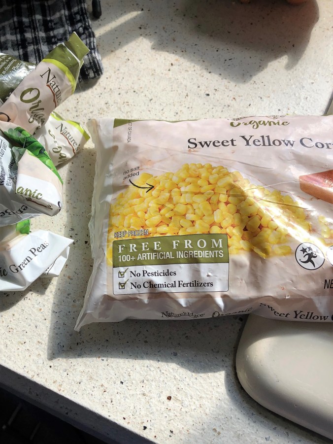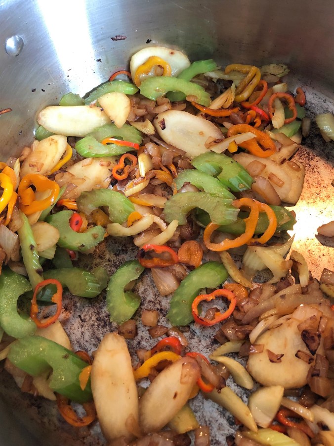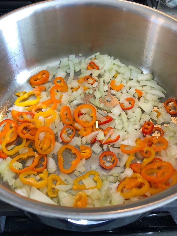 Today when I came home from yoga, I chopped some fresh veg (I was careful to use the last of some old celery before opening the new bag, so I am not completely hopeless). I sautéed the onion and peppers long enough for them to brown a little on the edges, and then I added some carrot and celery, sautéed a bit longer.