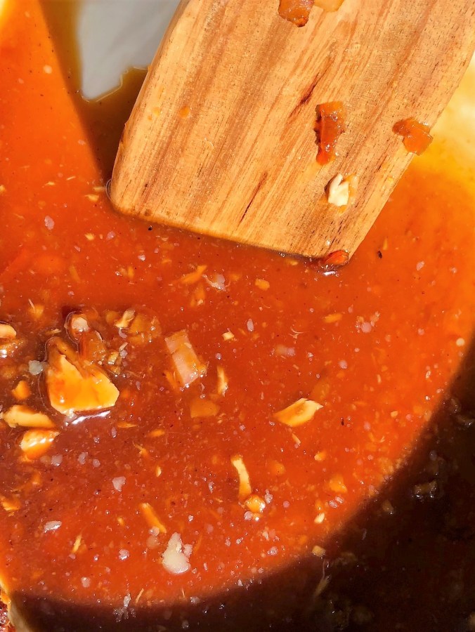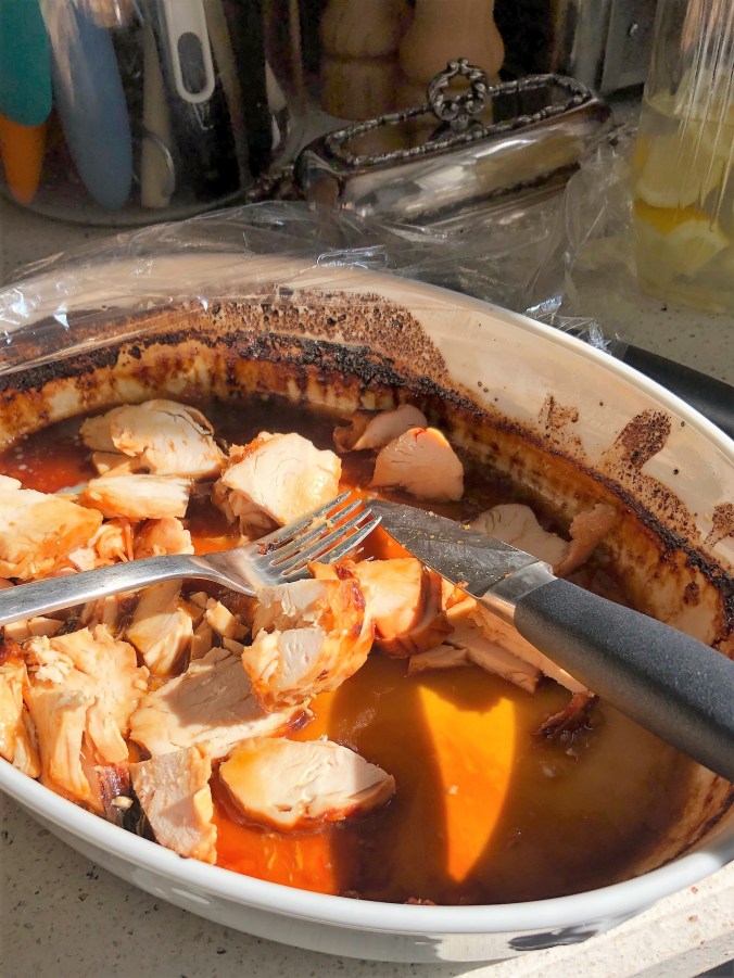 Here is a thing that makes the Chef happy: I made ‘kitchen sink soup’ earlier today. Some might call it ‘stone soup’—an aromatic, brothy soup made with whatever’s in the fridge/freezer/pantry. This time it was by design. I will share with you now how we make the Best Ever Soup. We started with our favorite ginger marmalade chicken last night, which we had with steamed Brussels sprouts the Chef jazzed up with Frank’s RedHot® Sauce. (Here is a close approximation of the ginger marmalade chicken recipe, should you wish to try it.)