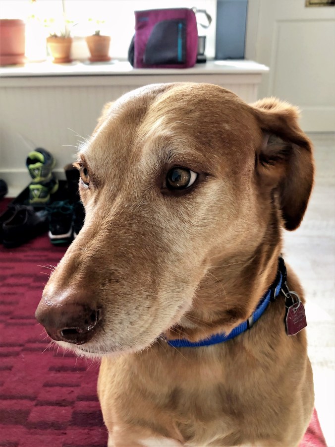 Last week at work we had employee reviews, and a certain dog-who-goes-to-work did not score high marks in ‘works and plays well with others.’ In fact, he was handed a pink slip. Scout is a complicated dog, does not possess the warm and effusive demeanor of a typical Lab, perhaps owing to what his vet deemed a healthy dose of Chessie genes, and thus a reserved Chessie disposition. He is a shy and skittish little guy, prone to startling at loud noises or sudden movements—a book shifting on a shelf, a blanket sliding off the sofa, a door slamming—these kinds of things upset our sensorial mystery dog, make him come out of his skin. For the last few months his habit of growling at newcomers to the office—and even a few oldcomers—has reached a high pitch, and the ‘A’ word has now popped up in the same sentence with ‘Scout.’ Would he react to a person with more than a growl? Probably not. Can I guarantee that? I’m not willing to sign off on it, especially if these proclivities are signaling fear aggression in our beloved Scout. So he’ll pass his days at home, effective immediately. It’s not the life we planned or anticipated for him when we invited him into our family. We’re scrambling now, trying to think of inventive ways to keep him happy and engaged. Soon he’ll try a full day at dog camp, instead of the half day he attends now. And I’ll change around the one day each week I work from home. So that will buy him two days of bumper-to-bumper companionship. And when our lengthening Vermont days gain just a little more early-morning light, I’ll start running with him first thing before I head to work, to help him feel settled while we’re away.