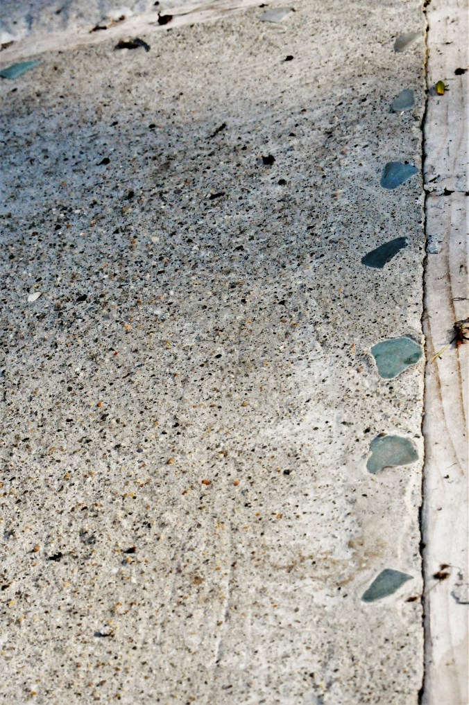 That is one clever chef, even if he does not know the difference between a barn and a tool shed. Also, you might be interested to know how our new concrete pad with the pretty little sea glass pieces fared over the winter. Here is a detail:
