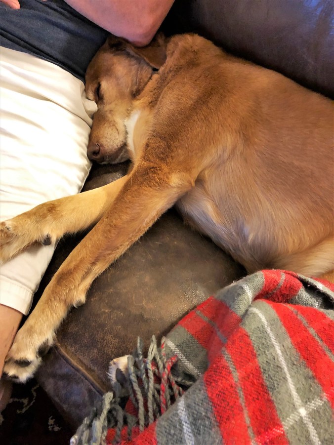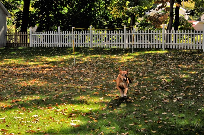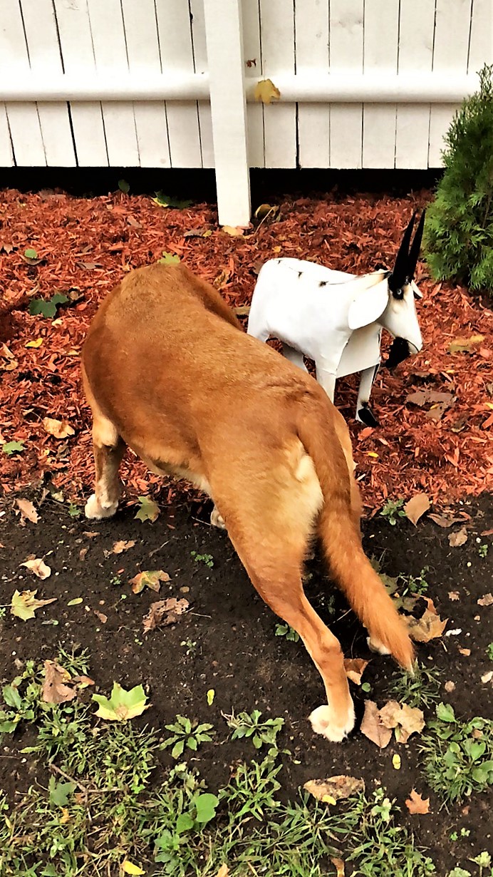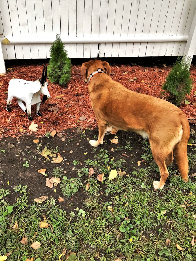 And so Scout has now accepted Van Goat as a member of the pack and is not nervous one bit, as you can see in this photo, where I tried to capture most of our new back fence, but was almost knocked senseless by one Goldapeake Retriever barreling towards me with joie de vivre, as he does. (Hence his blurriness.) I have learned to stand still on these occasions. He turns on a dime, at the very instant you expect a collision, and should you decide to move—that is when he’ll nail you at speed. One time he plowed into me with so much force he knocked a shoe off my foot and sent it sailing clear across the yard. Not making this up. And should you be concerned for his well-being, rest assured he just keeps on going whilst the hooman lady winces in pain and commences to licking her wounds.