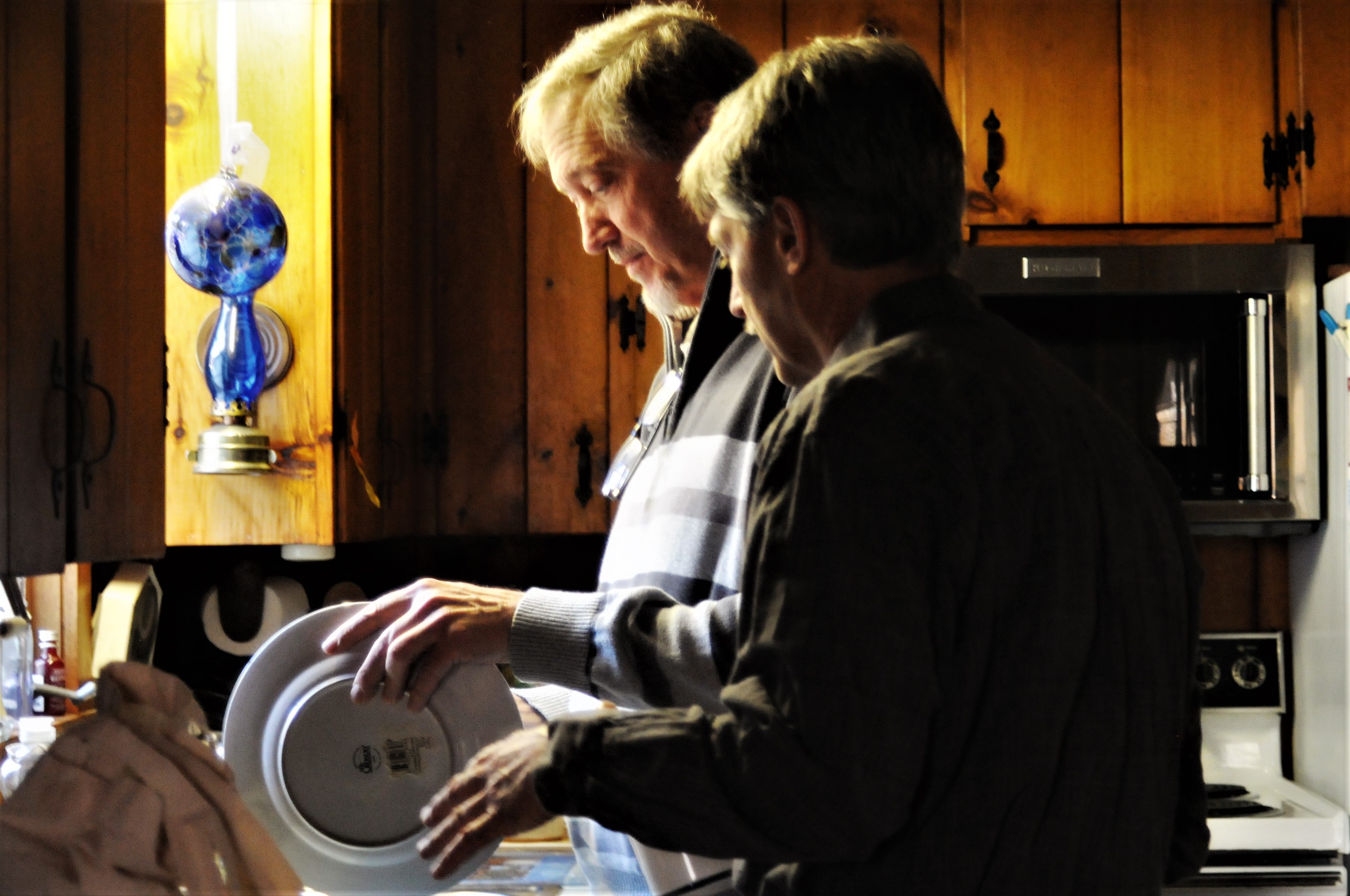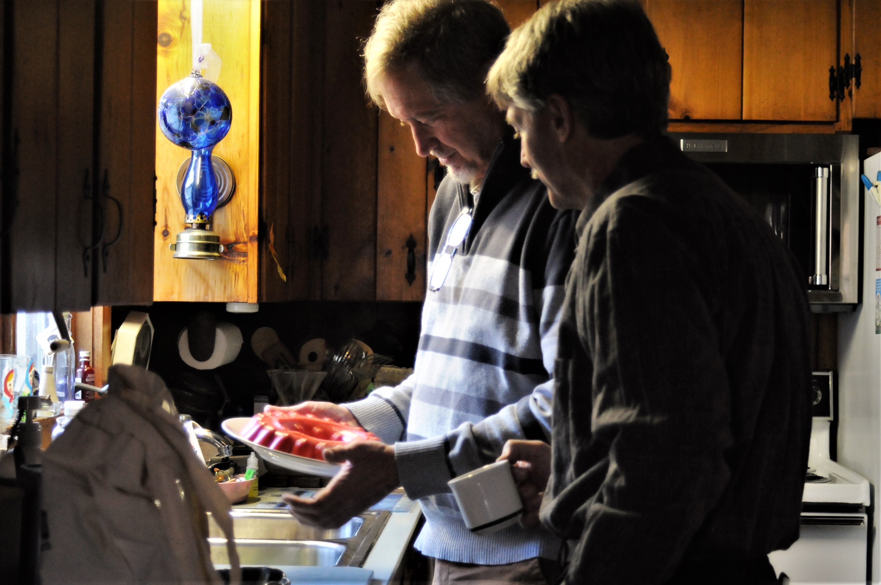 I managed to capture a series of photos of Chef David (he’s the tall one in the stripey sweater) and his brother Stan, trying to decide how to convince a Rubbermaid mold to unhand a congealed cranberry salad their mama made. I had to suck in my cheeks not to giggle at the spectacle—a professional pastry chef, and his older brother, debating the best course of action to avoid ruining the salad.