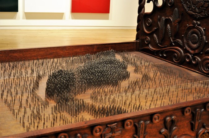 Argentinian Ad Minoliti’s Fantasías Modulares is a small exhibit with some of the most vibrant colors and bizarre, trippy imagery. “Trained as a painter, Minoliti draws on the rich legacy of geometric abstraction in her native country…where geometry was used as a tool for picturing utopian alternatives.” The Chef and I observed that this exhibit beckons kids to touch and interact with the fantastical, three-dimensional elements. Too bad, because, museum. No touch-y.