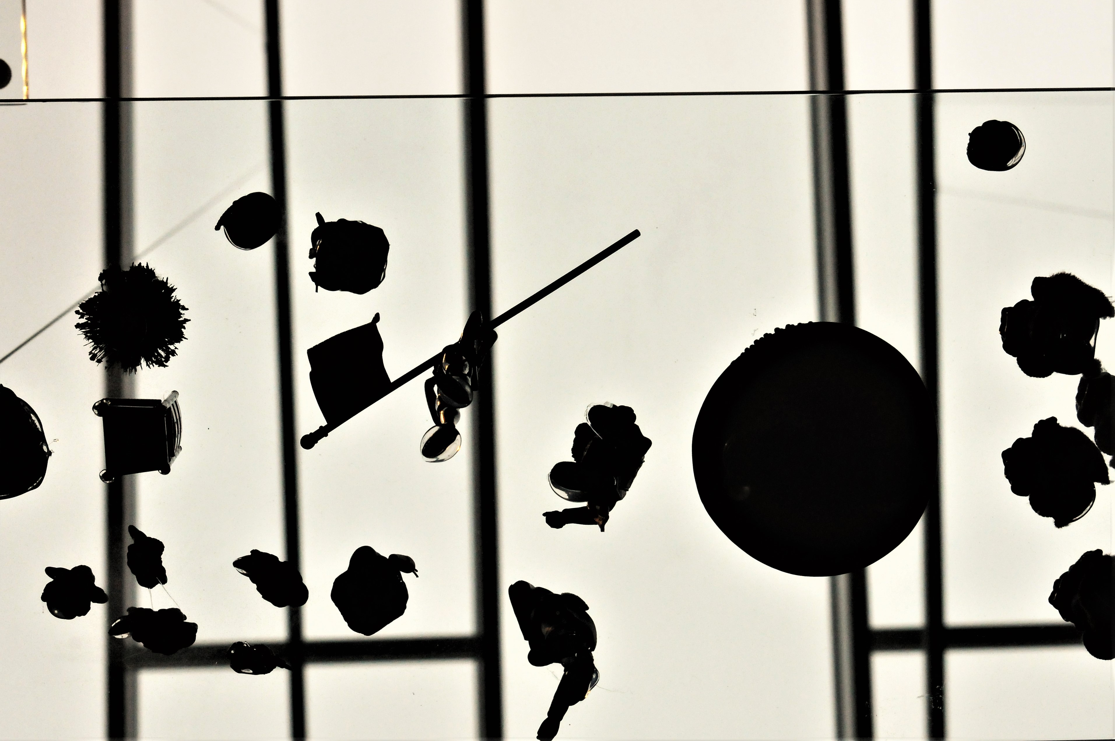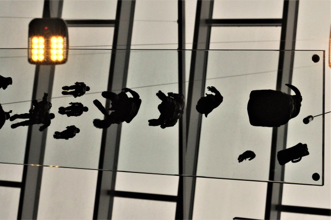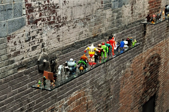 Sometimes art is purely fun. Artist Jarvis Rockwell’s collection of toys and action figures floats high up in a stairwell corridor awash with filtered light, marching parade-like across glass panels. I tried to shoot from different angles, starting from down below.