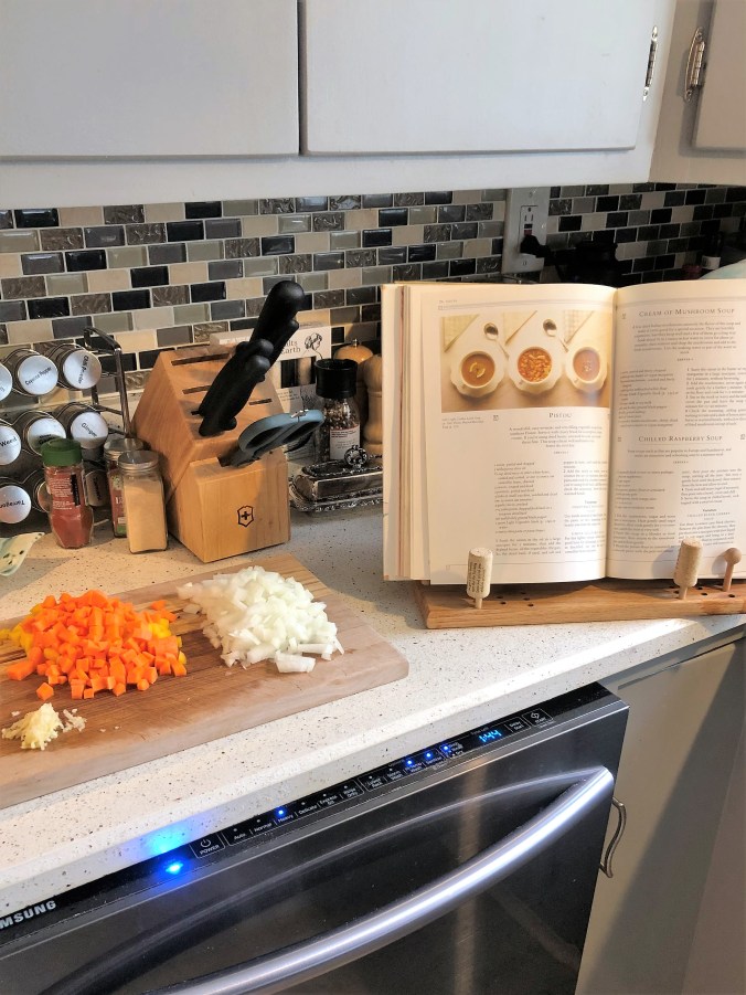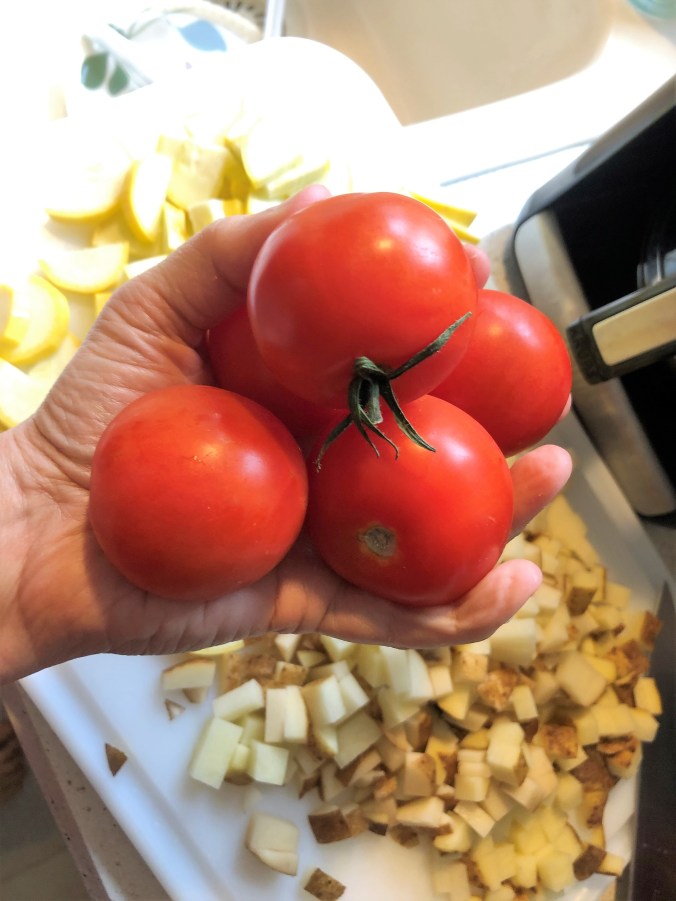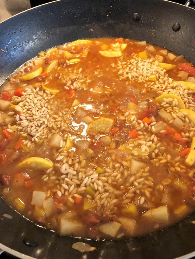 I haven’t been vegetarian for a long time, but I still love vegetarian cookery. I tweaked this recipe a little—first by using chicken stock instead of vegetable stock, because that is what we had in the pantry. And instead of using three leeks (or three small zucchini, went the recipe), I used yellow squash. The Chef observed that all that leek seemed like overkill for a soup that contains an entire chopped onion. And the store was out of zucchini, because, pandemic. Instead of using a 15-ounce can of cannellini beans, I used a mixture of Yellow Indian Woman and Eye of the Goat beans from Rancho Gordo. And instead of using a 15-ounce can of tomatoes, I used fresh Campari tomatoes, which have lots of flavor.