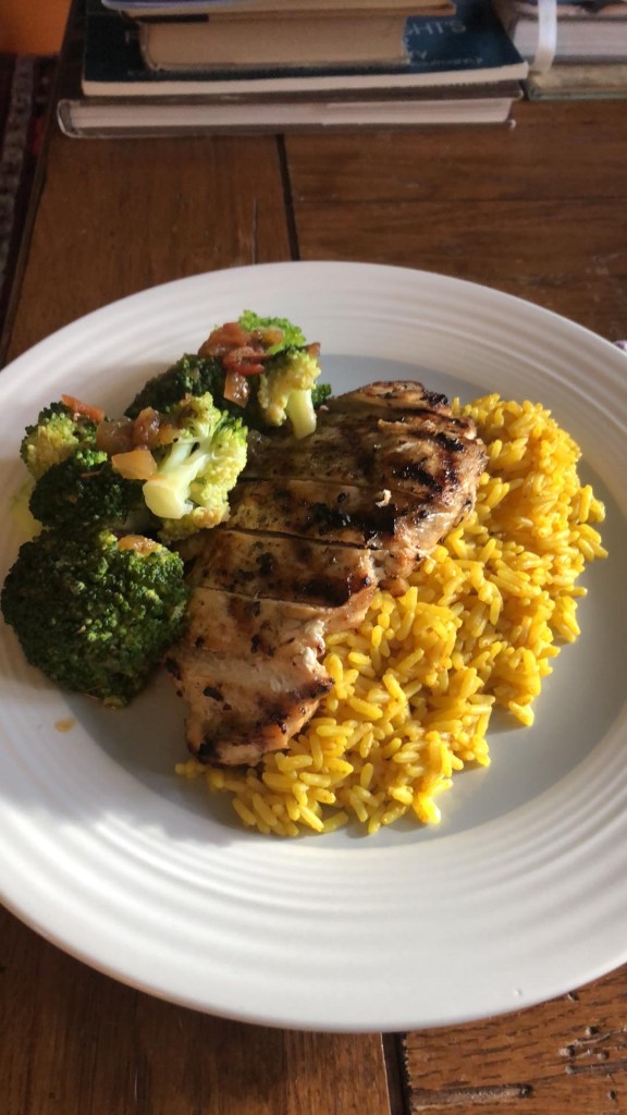 And then last night, Chef David put some chicken on the grill, and made broccoli sautéed in one of our favorite salsas, and served it all over curried rice.