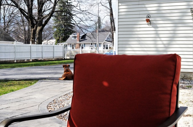 I couldn’t have foreseen sitting outside in our lovely outdoor space on the first warm, sunny spring day in Vermont while our world suffers through a pandemic, but here we are. Yesterday The Chef pulled all the outside furniture out of winter storage, brushed off the seat cushions, cleaned the glass tables, rolled out the rug. Looks like everything overwintered just fine, with only one small wart that’s completely fixable. Our outdoor room is officially open for the season, all the leaves and detritus are cleaned from the lawn, and Van Goat’s over on the fence row munching on some mulch. Might snow again, like it did this past week. No big deal; it’ll be gone in a matter of hours.