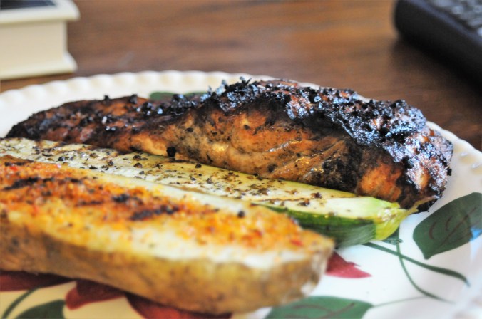 his sullenness was forgotten at suppertime, when there was grilled salmon; this is grilled salmon face