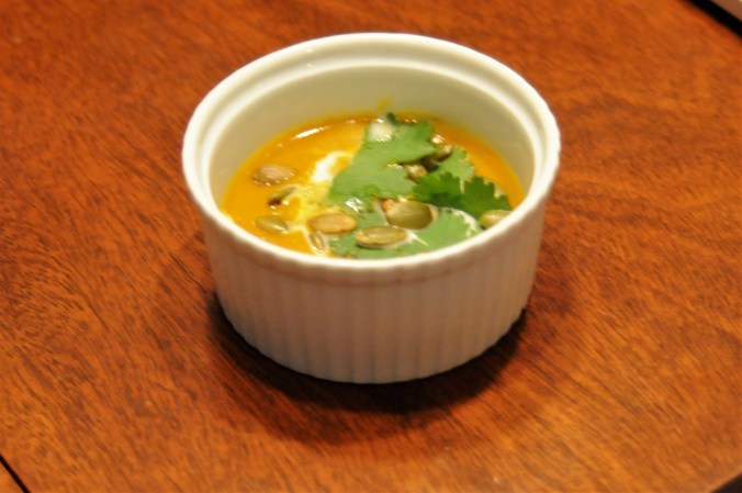 Sometimes all I want for the work week ahead is a brothy, noodle-y soup, but right now I’ve been yearning for something that sticks to my ribs a little more, with some substance to it. Today I made coconut curry pumpkin soup, and it turned out beautifully. It breaks my fat calories rules, a little, but I’ve been exercising more than usual lately (did I mention I bought a new Apple Watch?) and so decided to allow this bit of indulgence. Forgive the out-of-focus image.