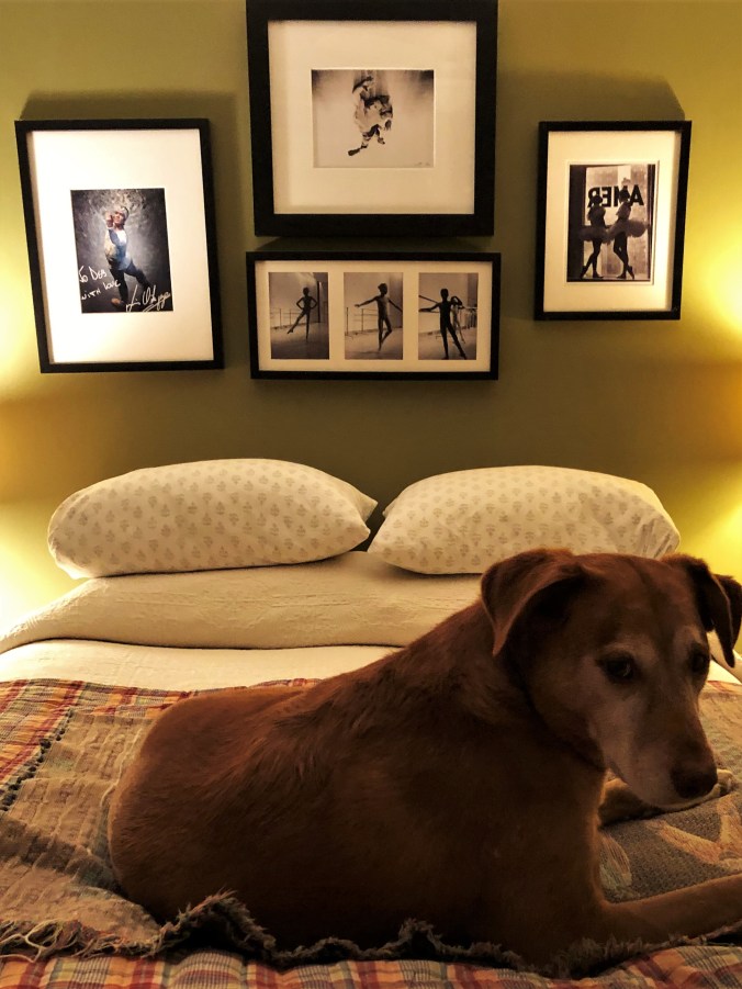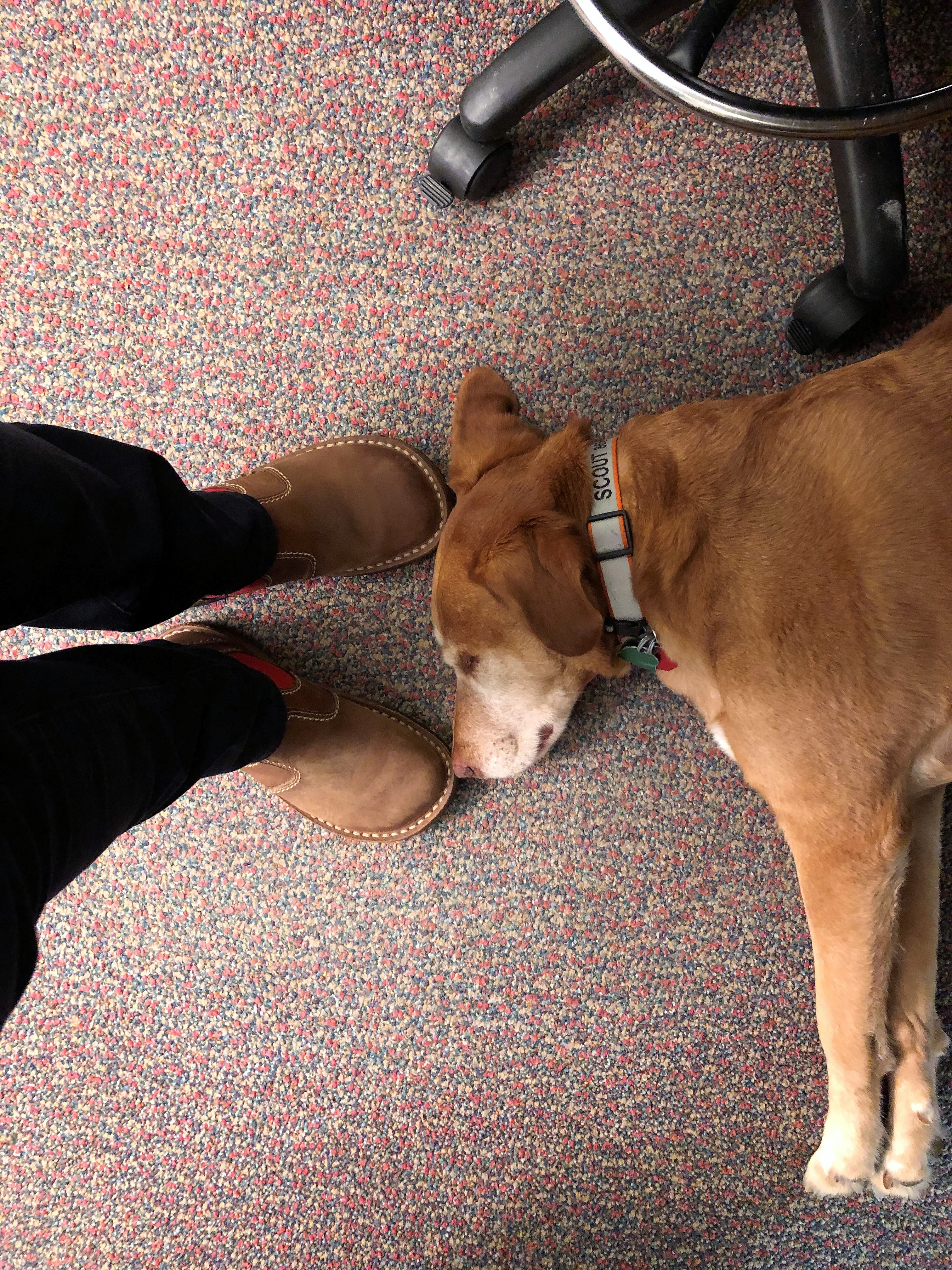 Scoutie tweaked his wrist sometime between Monday evening and Tuesday morning. He typically starts his nights up in the bed with us, and then grows too warm and so hops down and trots off down the hallway and into our home office, where a delicious memory foam dog bed awaits him right under my desk. Then usually around 4:00 or so in the morning, he rejoins us.