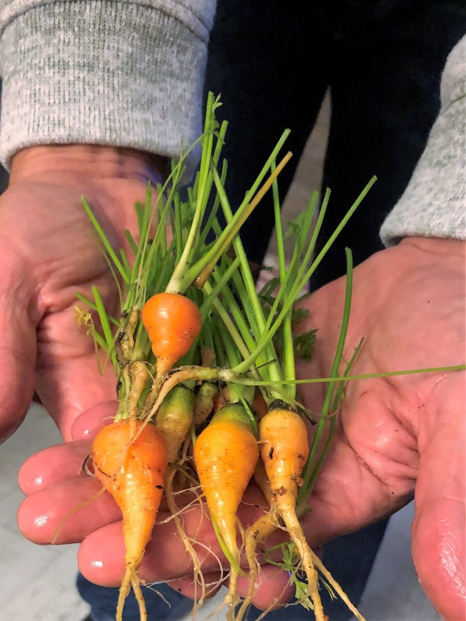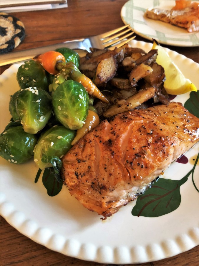 Yep, that’s the sum total of our carrot crop. But they sautéed up beautifully with Brussels sprouts and a maple glaze with sesame seeds, a tender and sweet accompaniment to our supper of salmon and fancy homemade hash brown potatoes.