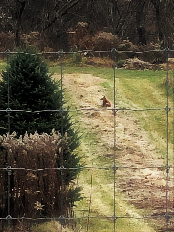 I went on a longish walk this afternoon with a pair of friends, which is always fun, and we came across this red fox hanging out in the Christmas tree farm where we get our tree every year. It seemed unimpressed by us, and sat there on its rump furiously scratching one ear. Fleas, one of my friends observed. Sorry for the low resolution—I promise it’s a red fox, and its tail was absolutely glorious, fleas notwithstanding.