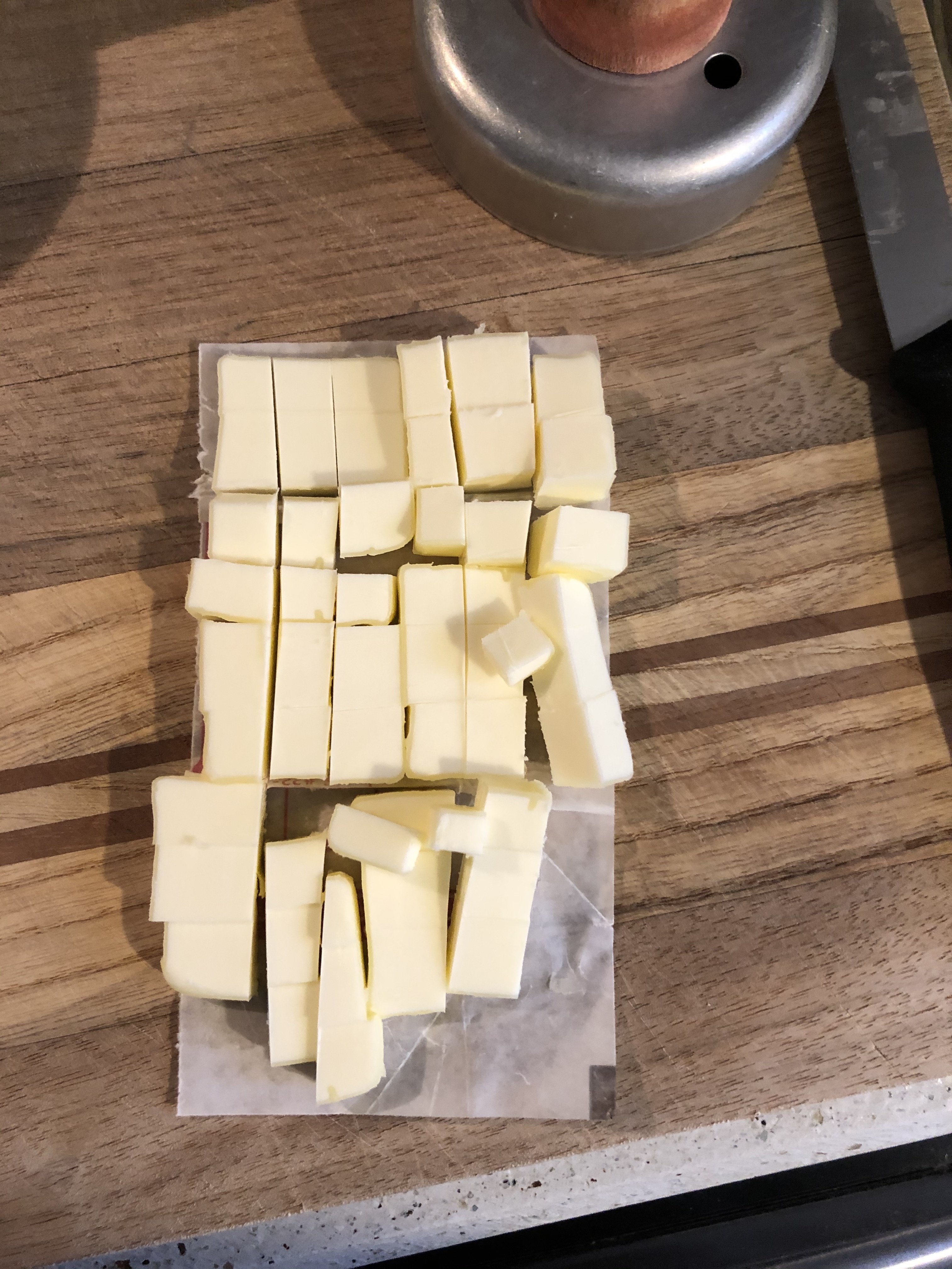 2. Next, you’ll need 3 tablespoons of cold butter. It has to be cold. Then you’ll chop the butter into little bits like so: