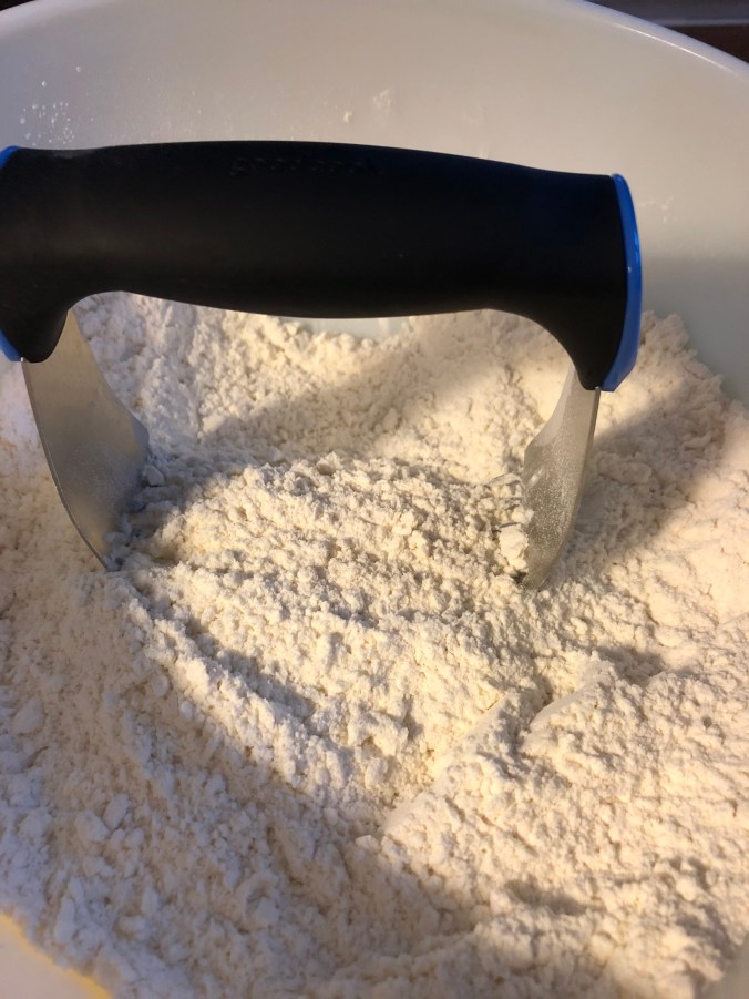 3. Now you’ll take that dough blender, grab some coffee, and go sit down in front of the telly and work the little bits of butter into the flour. It’ll take, I dunno, maybe fifteen minutes or so to do.
