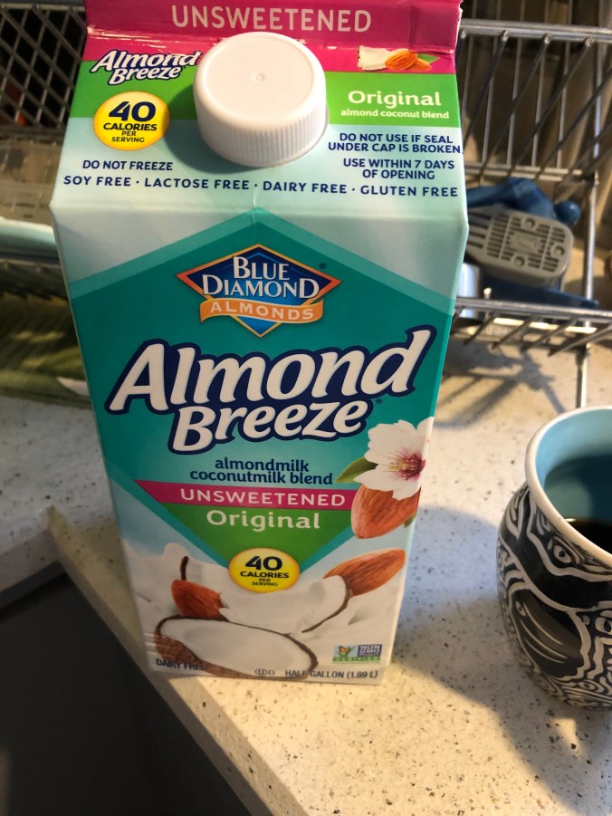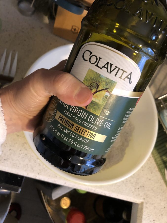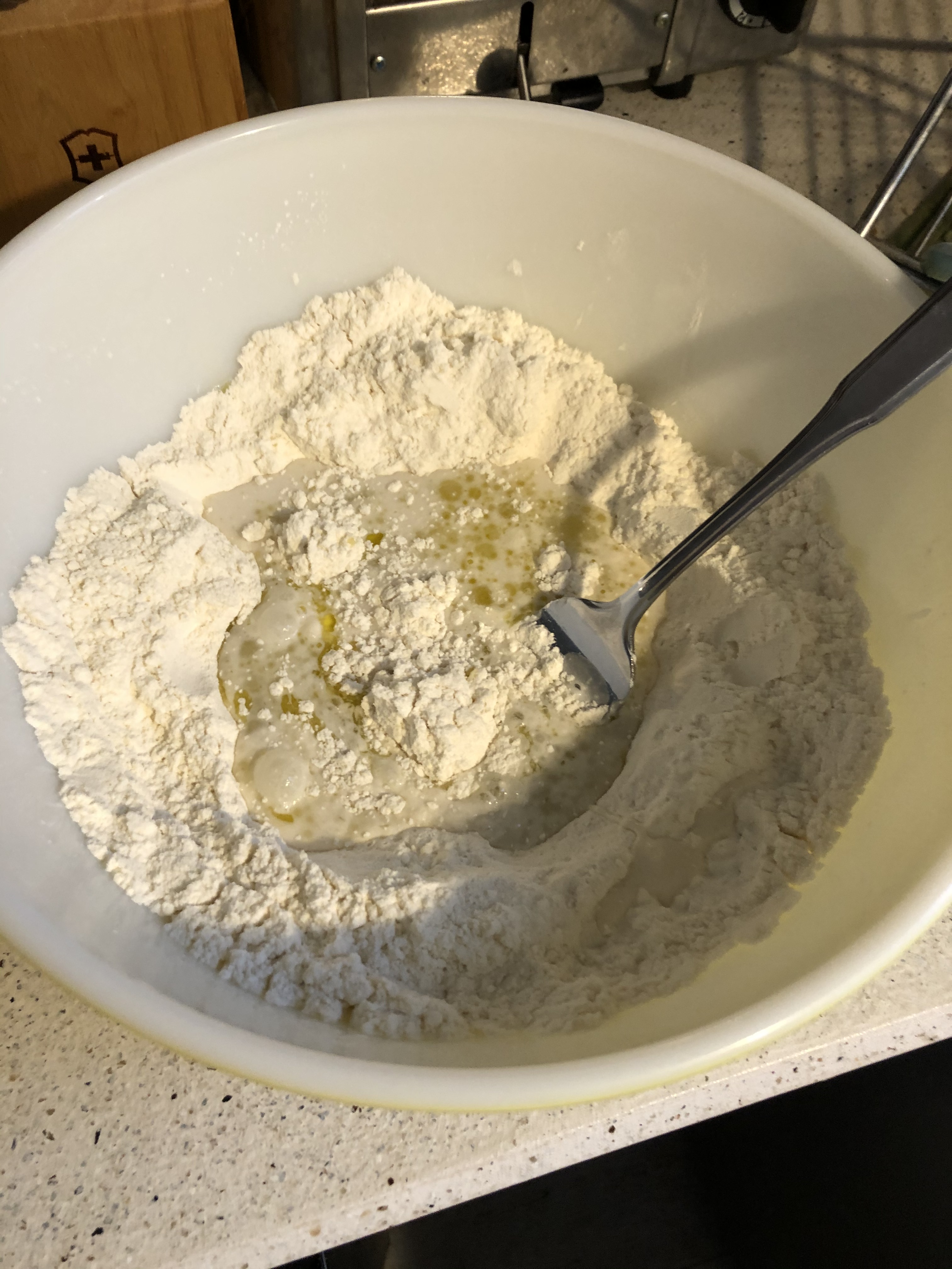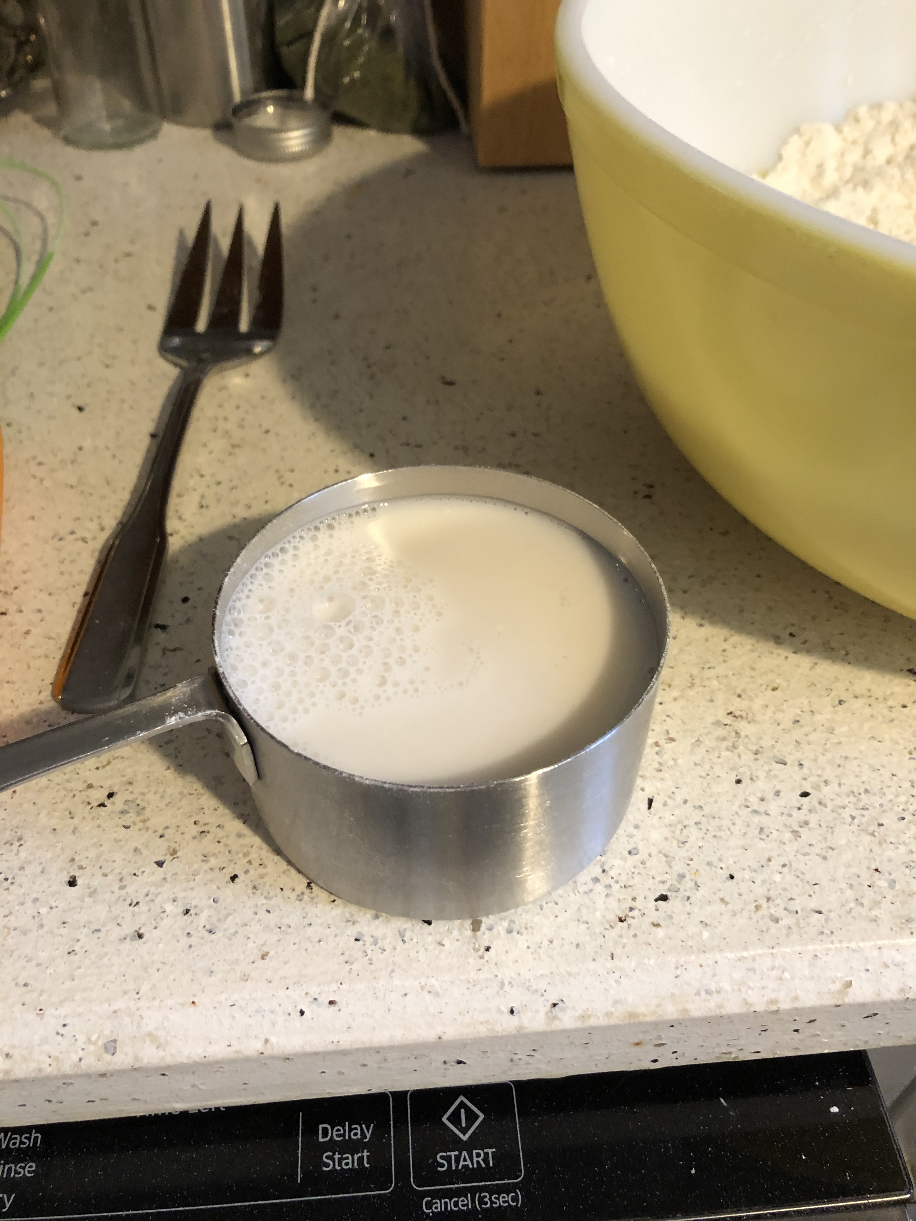 4. Make a well in the middle of the mixture as I have ^ in this photo. It’s where you’ll add your wet ingredients next, which will be 3 tablespoons of oil (olive oil works fine, but if you prefer another kind, use that instead), and almost one cup of milk. I’ve been using almond coconut milk. You can also use plain old milk, or even buttermilk.