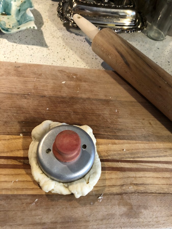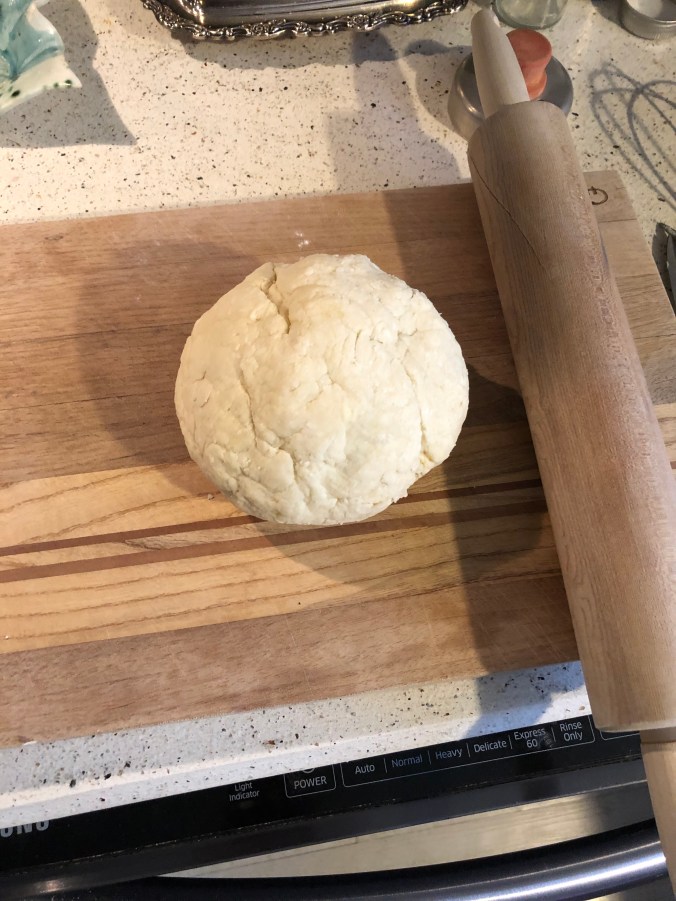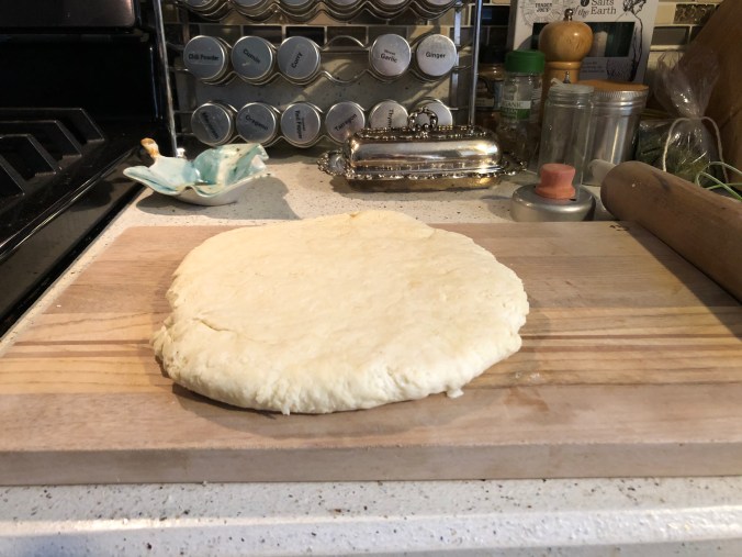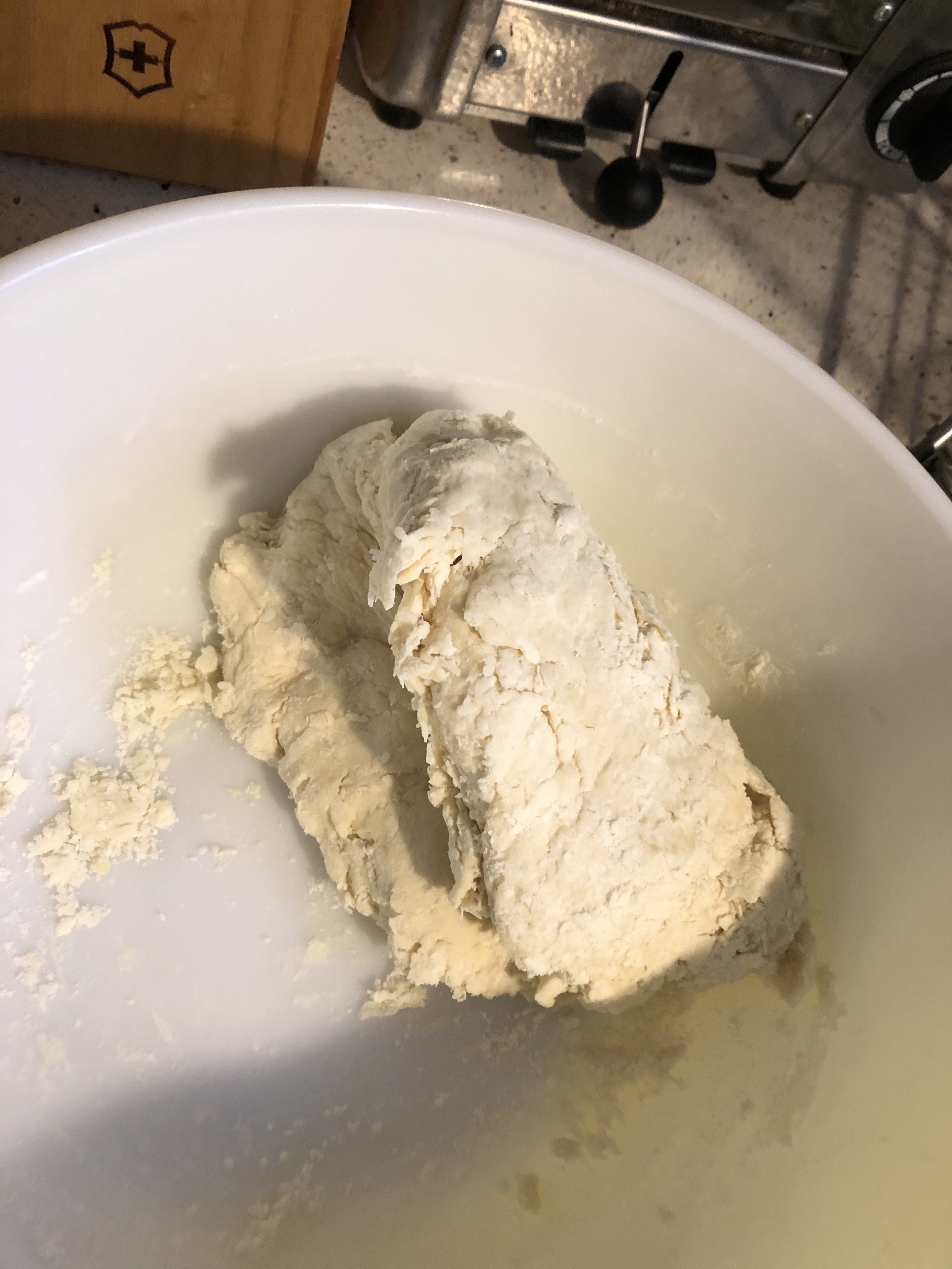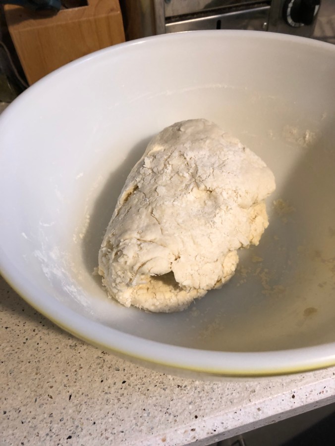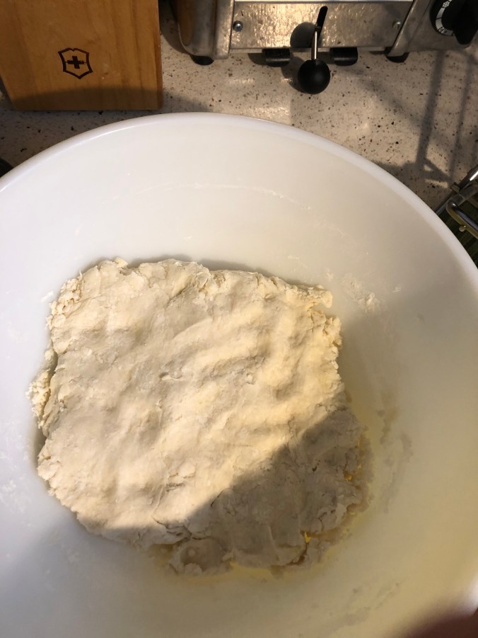 6. Granny’s recipe says, “knead three or four times.” This basically means, fold and smoosh, about four times. Chef David will tell you overworking the dough is bad, because the baked product will be less flaky. So resist overdoing it.