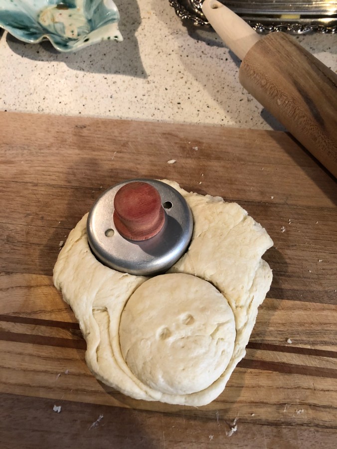 8. Roll it out as thick or thin as you please. You can do this with a rolling pin, or even a drinking glass, or you can just work it flat with your hands. If you’re using an old-fashioned biscuit cutter like I have (found mine at a flea market), you’ll want your dough to be no thicker than about an inch and a half. But you can also use a drinking glass to cut out your biscuits and make them as thick as you want.