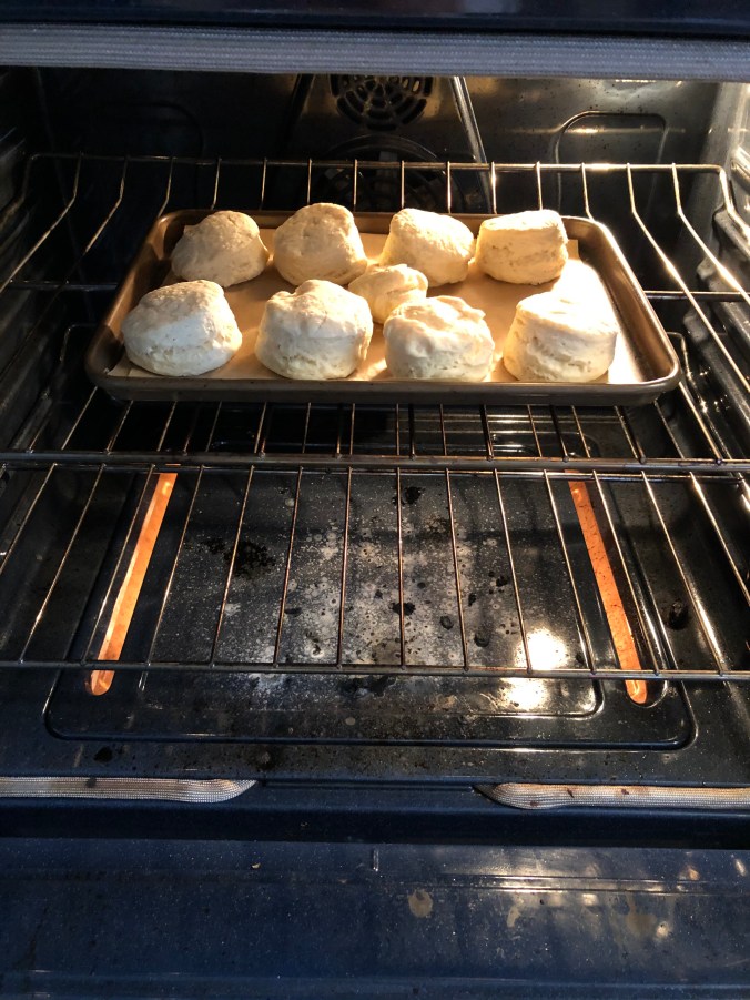 11. There’s always a little leftover dough that makes a weird biscuit; I give it to Scout-the-Goldapeake-Retriever. After the biscuits bake 7 minutes, you’ll want to turn the sheet around and put another 8 minutes on the timer. They’ll bake more evenly if you turn them. Here’s how they look at 7 minutes: